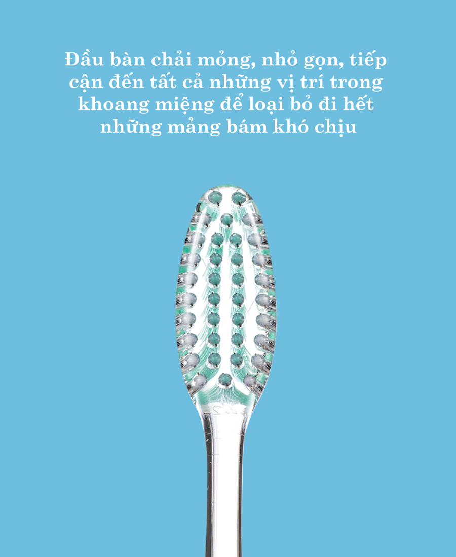 Đầu bàn chải mỏng, nhỏ gọn, tiếp cận đến tất cả những vị trí trong khoang miệng để loại bỏ đi hết những mảng bám khó chịu.