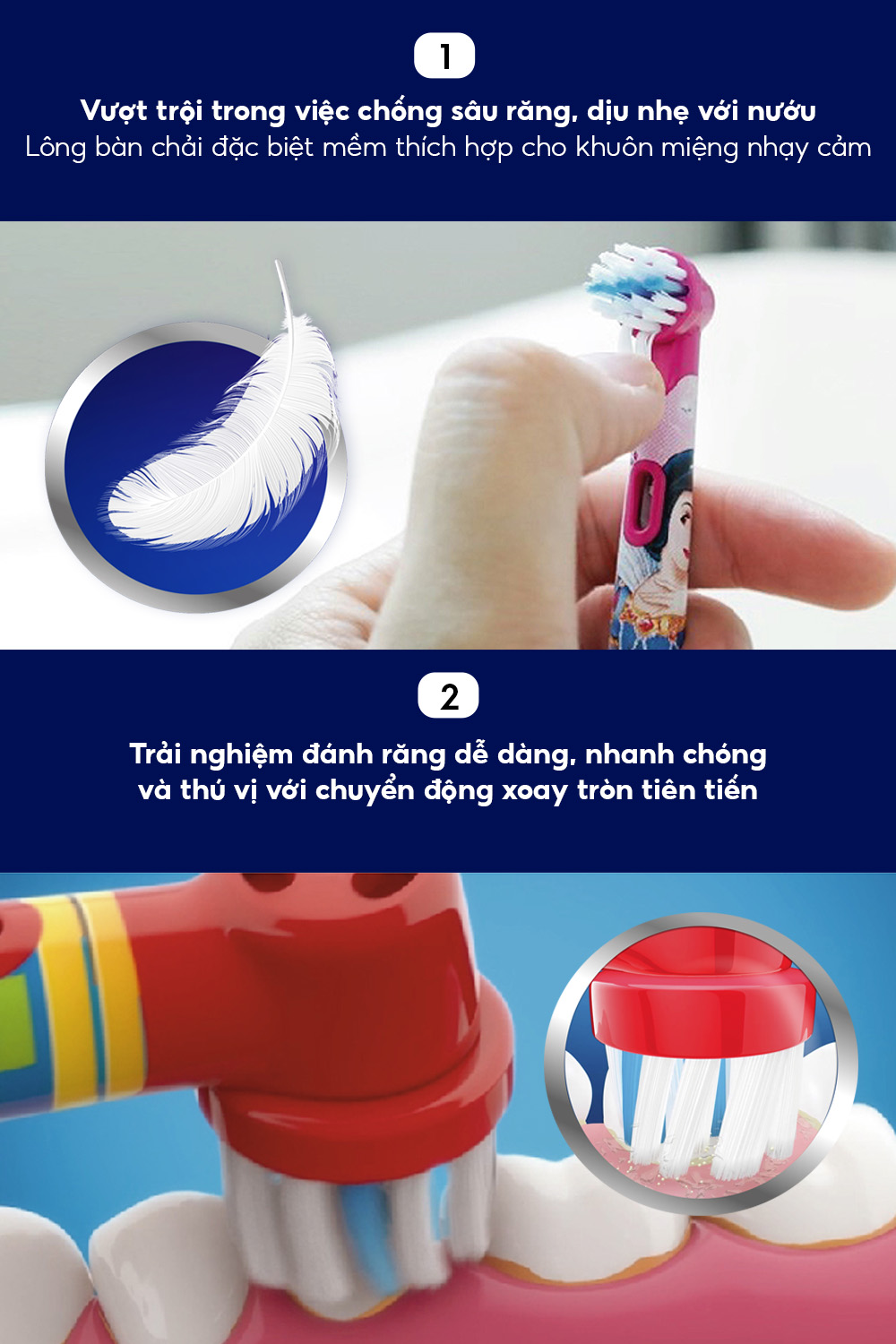 Bàn chải pin Oral B cho bé được thiết kế với đầu bàn chải nhỏ và mềm dành riêng cho trẻ nhỏ. Giúp làm sạch bề mặt răng và bề mặt nhai của bé kỹ