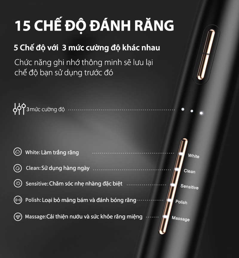 Lorca TA-9208TB còn nổi bật với 15 chế độ chải răng cùng 3 mức cường độ, phù hợp với mọi nhu cầu chăm sóc răng miệng. Thiết bị tích hợp tính năng ghi nhớ chế độ sử dụng gần nhất và chu trình chải 2 phút theo khuyến nghị của nha sĩ, giúp bạn tối ưu hóa việc làm sạch răng miệng.