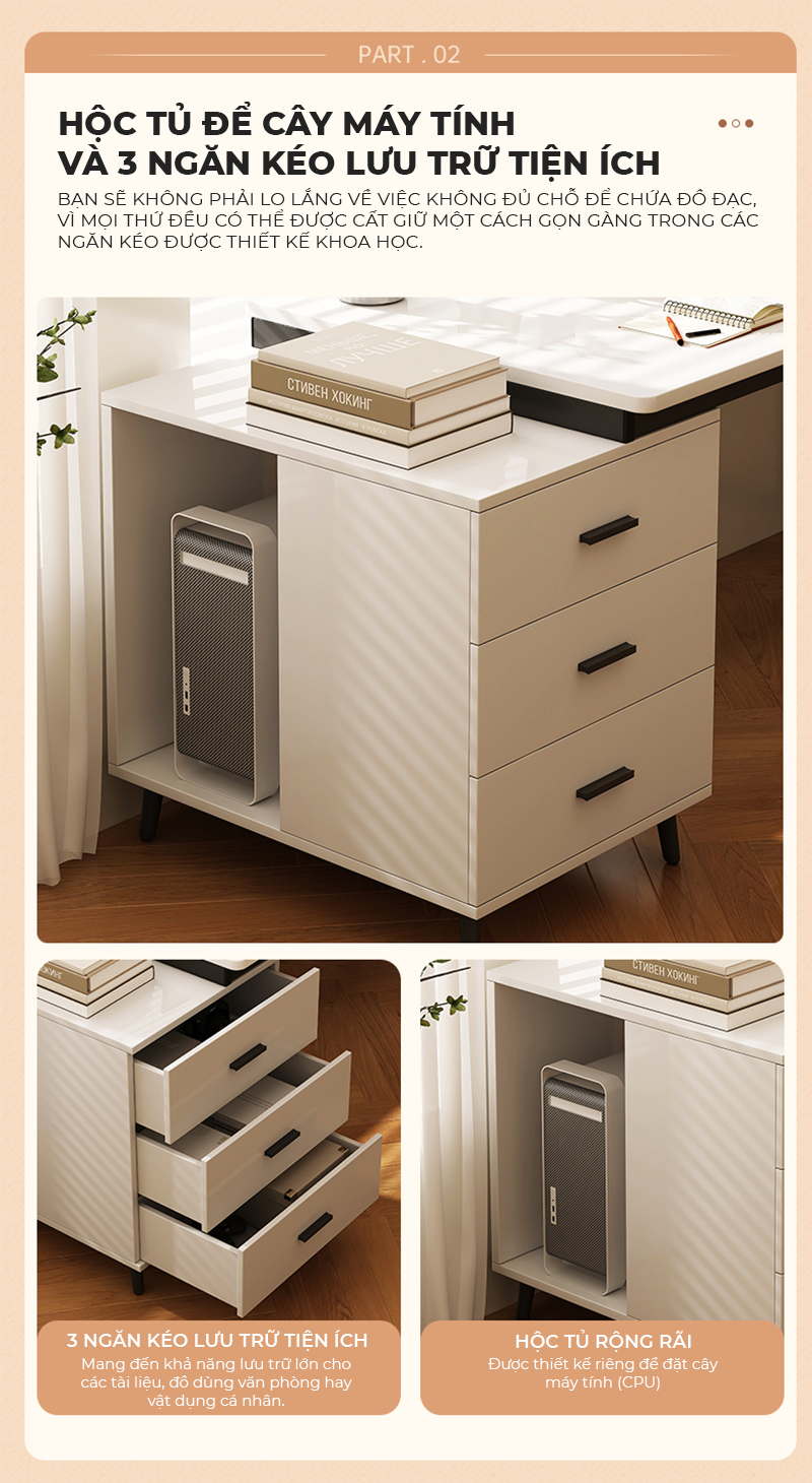 Công năng: Là mẫu bàn làm việc có thiết kế hiện đại kèm tủ hồ sơ đa năng phù hợp tại nhà và cả văn phòng làm việc