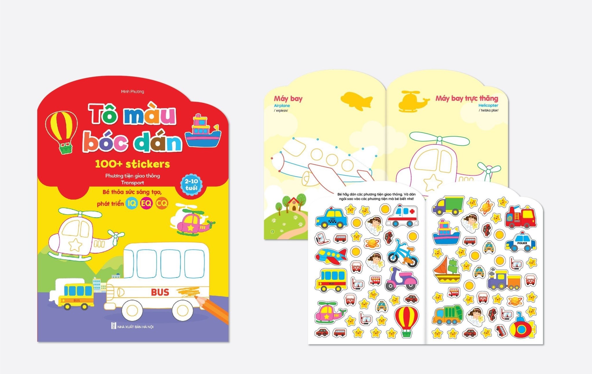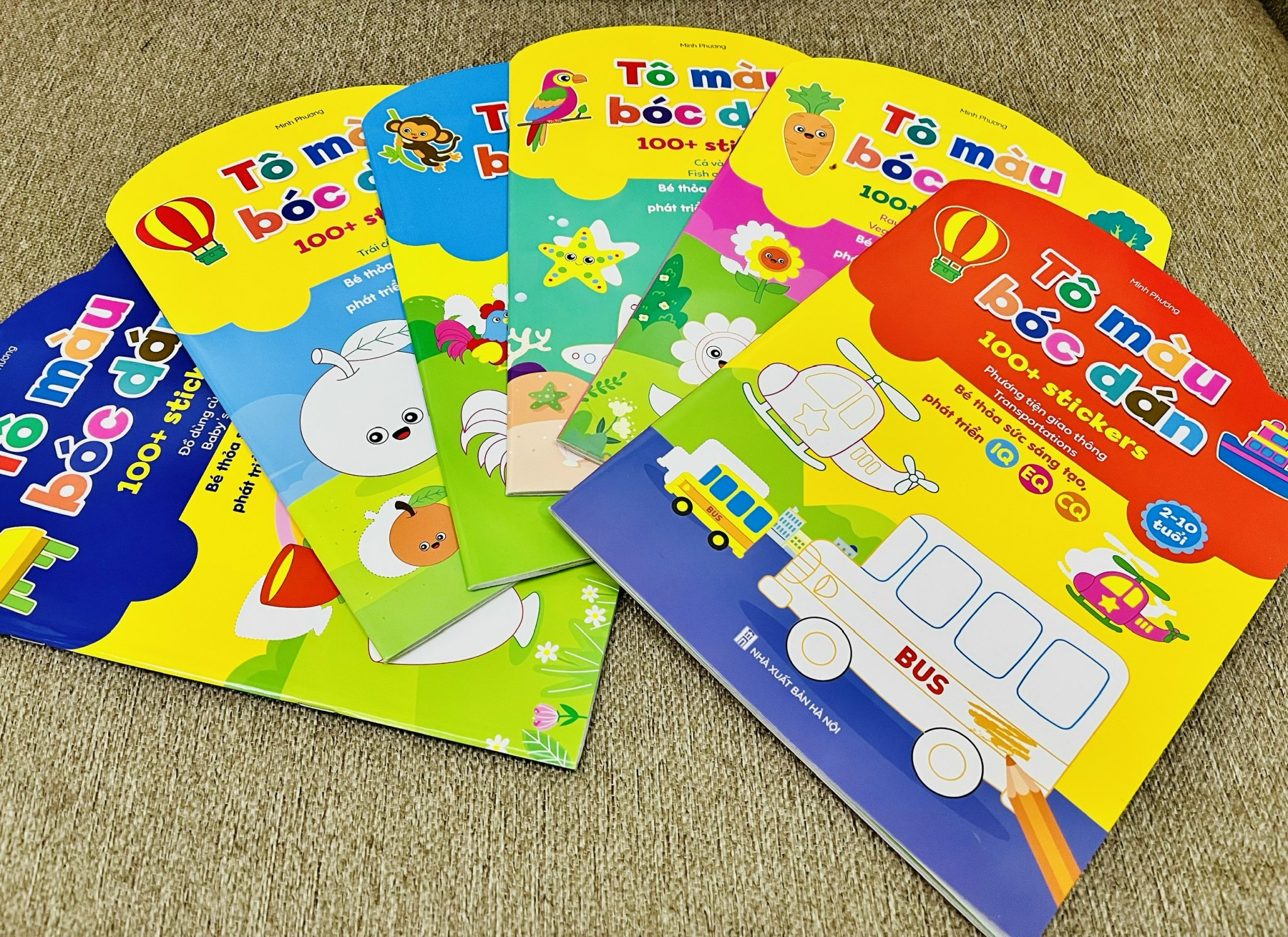 Bộ sách Tô màu bóc dán 100+ stickers (song ngữ Anh – Việt) gồm 6 cuốn với 6 chủ đề khác nhau