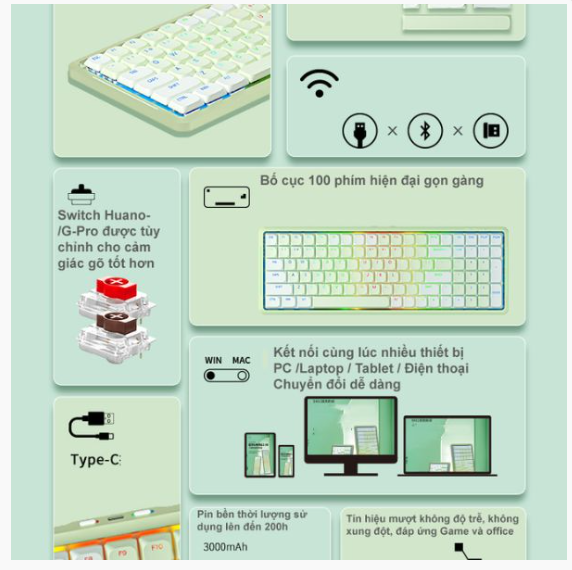 THÔNG SỐ KỸ THUẬT: Tên sản phẩm: Bàn phím cơ không dây Dualmode NEWMEN Mama SK01 Matcha Milk Sugar Phương thức kết nối : bluetooth , 2.4g , có dây C Số lượng phím 100
