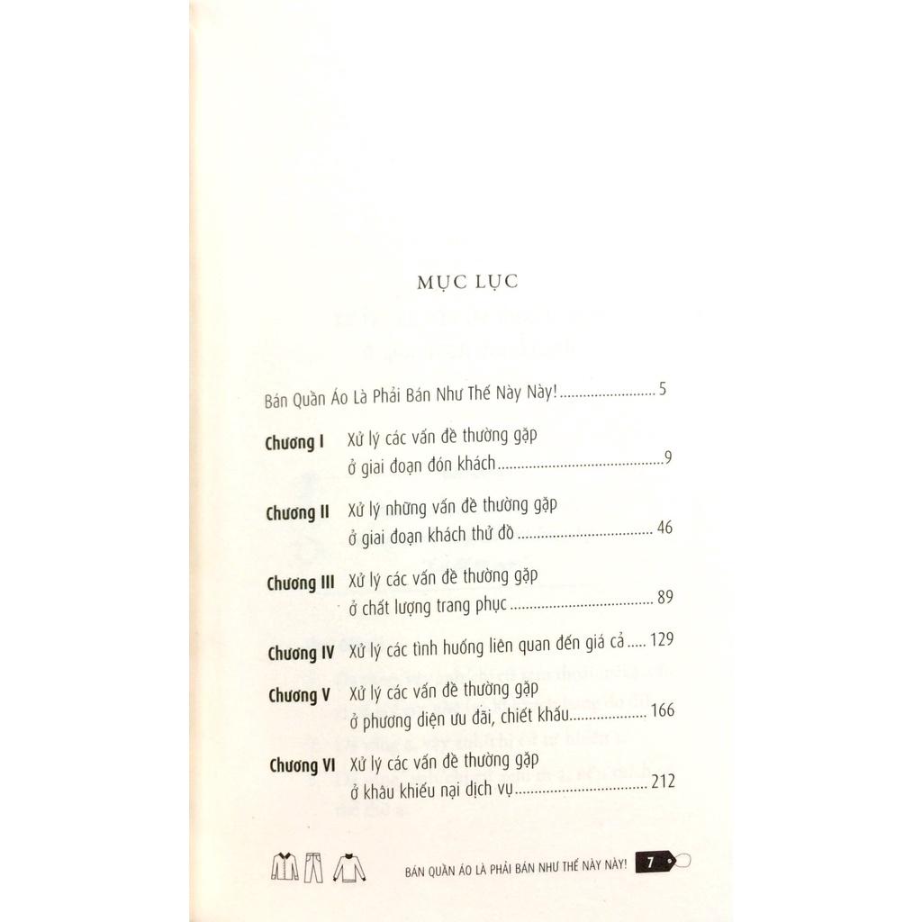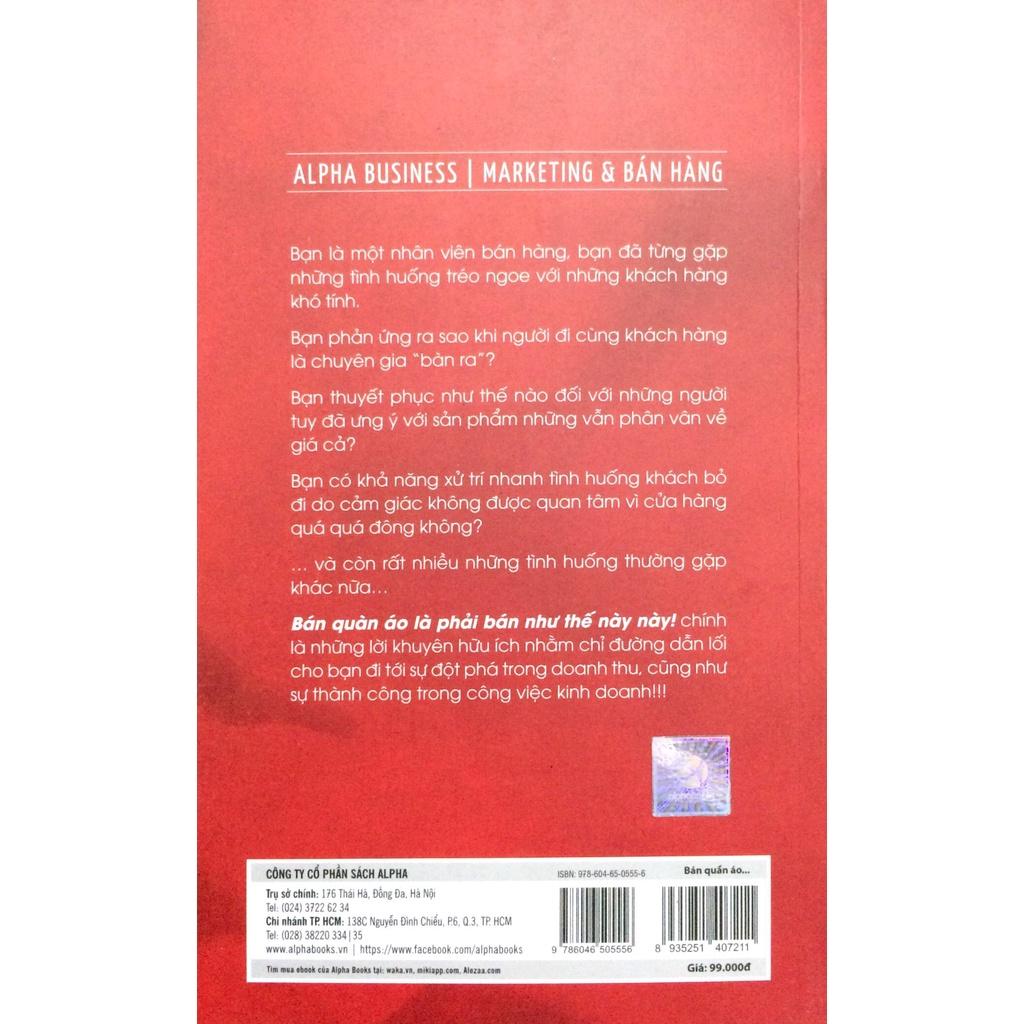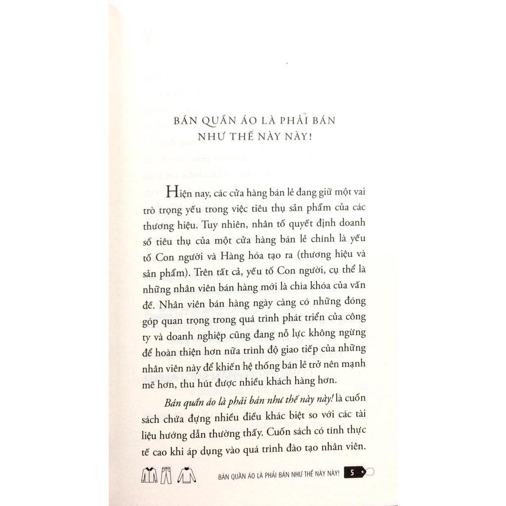 Bán quần áo là phải bán như thế này này! là cuốn sách chứa đựng nhiều điều khác biệt so với các tài liệu hướng dẫn thường thấy. Cuốn sách mô tả một cách toàn diện việc kinh doanh trong lĩnh vưc thời trang với các chiến lược bán hàng cụ thể, thực tế, có tính thực tế rất cao khi áp dụng vào việc đào tạo nhân viên. Cuốn sách kinh doanh này đồng thời cũng đưa ra những hướng dẫn, gợi ý, các mẫu câu sử dụng phù hợp với ngữ cảnh giúp việc trao đổi với khách hàng trở nên gần gũi thuyết phục.