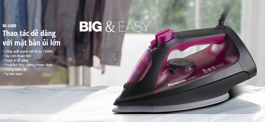 Thiết kế hiện đại Bàn Ủi Điện Panasonic NI-U400CPRA có thiết kế đẹp mắt, khỏe khoắn cùng màu sắc bắt mắt đem đến cho không gian nhà bạn cảm giác tươi mát. Đặc biệt, sản phẩm còn chú trọng vào tay cầm chắc chắn dễ dàng cầm nắm, trượt đẩy thoải mái nhờ trọng tâm cân bằng thấp. Công suất 2300W Thiết bị được hoạt động với công suất siêu mạnh mẽ tối đa 2300W, sẽ giúp ủi thẳng các vết nhăn nhanh chóng nhờ việc sản sinh ra lượng hơi nước với áp suất mạnh và độ nước cao. Mặt ủi lớn, ủi nhanh hơn Mặt đế ủi được làm bằng chất liệu Ceramic chống dính giúp cho bàn là có thể lướt đi nhẹ nhàng trên bề mặt vải. Mũi bàn là được thiết kế nhỏ, nhọn dễ dàng lướt tới những vùng khó là nhất, như hàng cúc, cổ áo hay tay áo. Đặc biệt, mặt ủi được thiết kế có diện tích lớn hơn so với các dòng ủi thông thường, giúp tiết kiệm thời gian ủi hơn. Hơi nước tản nhiệt đều Bàn ủi trang bị 27 lỗ thông dọc theo rãnh chữ U tản đều trên mặt đế giúp tăng hiệu suất tạo hơi nước, hệ thống hơi nước Power Shot phun lượng lớn hơi nươc tập trung, giúp làm mềm vải và làm phẳng các nếp nhăn nhanh chóng và còn có thể loại bỏ mùi hôi bám vào quần áo khó giặt như những trang phục comle, Hình dạng đế độc đáo với các cạnh tròn và cấu tạo đế viền cong giúp ủi áo không bị vướng, không làm cho vải co lại, cho việc là quần áo 1 cách dễ dàng và thoải mái. Thích hợp với mọi loại vải Ngoài ra, bản ủi Panasonic thích hợp với mọi loại vải, có vòng chỉnh nhiệt giúp lựa chọn được mức nhiệt độ phù hợp cho từng loại vải, đèn báo sẽ tự tắt khi đạt mức nhiệt cần thiết, bảo vệ quần áo không bị cháy xém do gặp phải nhiệt độ quá cao. Chống nhỏ giọt Bàn ủi Panasonic có chức năng chống nhỏ giọt và chế độ chống cặn, giúp ngăn không cho nước rò rỉ ra ngoài, không làm ố vàng quần áo, bằng cách khi nhiệt độ của bàn ủi giảm xuống đến một mức nhất định, bàn là sẽ tự động cấp nước để ngăn chặn rò rỉ từ các lỗ thông hơi. Và khả năng tự làm sạch thông minh, chỉ bằng 1 nút nhấn sẽ tự động tháo nước trong khoang chứa nước để làm sạch ngay lập tức.