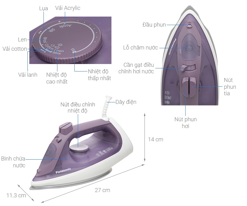 Bàn ủi hơi nước Panasonic NI-S430GRA có mặt đế Silver Titan chống dính trượt êm nhẹ trên bề mặt quần áo, ủi thẳng các nếp nhăn nhanh với công suất 2300W, ủi được nhiều quần áo với dung tích bình chứa 300 ml, có nhiều chức năng ủi đáp ứng tốt nhu cầu sử dụng trong gia đình. Thiết kế của sản phẩm - Bàn ủi Panasonic thiết kế tối giản, tông màu trẻ trung, chỉ nặng 1.1 kg kết hợp với tay cầm vừa vặn cho bạn cầm nắm và di chuyển bàn ủi linh hoạt. - Đế tựa kích thước hợp lý cho bạn dựng đứng bàn ủi dễ dàng, ổn định, hạn chế ngã, đổ.  Mặt đế - Thiết kế mặt đế Silver Titan chống dính lướt mượt mà trên tất cả các chất liệu vải, hạn chế trầy xước, dễ dàng làm sạch. - Mặt đế hình chữ U cho bạn thay đổi hướng ủi dễ dàng, thuận tay.  Công suất và dung tích bình chứa - Bàn ủi hơi nước có công suất hoạt động lên đến 2300W giúp làm nóng bàn ủi trong thời gian ngắn, phun hơi mạnh mẽ, đồng đều, ủi thẳng các nếp nhăn dễ dàng.  - Bình chứa nước dung tích 300 ml ủi được tầm 4 - 5 bộ quần áo trong một lần ủi, nên sử dụng nước sạch, không dùng nước xả quần áo, nước hoa. Bảng điều khiển - Trang bị bảng điều khiển nút xoay, nút nhấn và nút gạt cho bạn tùy chỉnh các chức năng ủi, nhiệt độ ủi thuận tiện.  - Có nhiều chức năng ủi: phun hơi, phun tia, ủi khô và ủi hơi nước.  Tiện ích - Hỗ trợ tính năng chống nhỏ giọt giảm khả năng bị rò rỉ nước khi cài đặt ở nhiệt độ thấp, tăng cường độ bền cho thiết bị và đảm bảo an toàn cho người dùng. - Hệ thống chống đóng cặn hạn chế tình trạng tắc nghẽn lỗ thoát hơi nước, giúp nước phun ra trong sạch, ủi đồ bền đẹp dài lâu.  - Thiết kế mũi nhọn, rãnh cúc tiện lợi giúp chị em len lỏi bàn ủi vào các khu vực nhỏ, hẹp như nách áo, cổ áo, hàng cúc áo,... dễ dàng. - Không xoắn dây với thiết kế dây nguồn xoay 360 độ, thao tác bàn ủi không sợ vướng víu.   Lưu ý khi sử dụng - Không bao giờ đổ chất tẩy vào bên trong bàn ủi vì có thể làm hỏng các bộ phận chức năng sản phẩm. - Luôn đặt bàn ủi đứng trên đế để bảo vệ lớp chống dính của mặt đế không bị xước, mòn, dính bẩn. - Trong khi sử dụng, các lần nhấn nút tia nước nên cách nhau khoảng 2 giây để không tạo ra vệt nước trên quần áo. - Chỉ nên sử dụng bàn ủi với mục đích ủi vải, không dùng cho mục đích khác. - Khi ủi quần áo ướt nên dùng chức năng ủi khô vì có thể gây phỏng do nước nóng bắn ra từ thân bàn ủi chính.  Bàn ủi hơi nước Panasonic NI-S430GRA 2300W thiết kế gọn gàng, mặt đế Silver Titan chống dính độ bền cao, dễ làm sạch, ủi đồ nhanh chóng với công suất lớn, dung tích bình chứa 300 ml ủi được nhiều bộ quần áo, sử dụng bền bỉ, an toàn với hệ thống chống đóng cặn, chống nhỏ giọt.