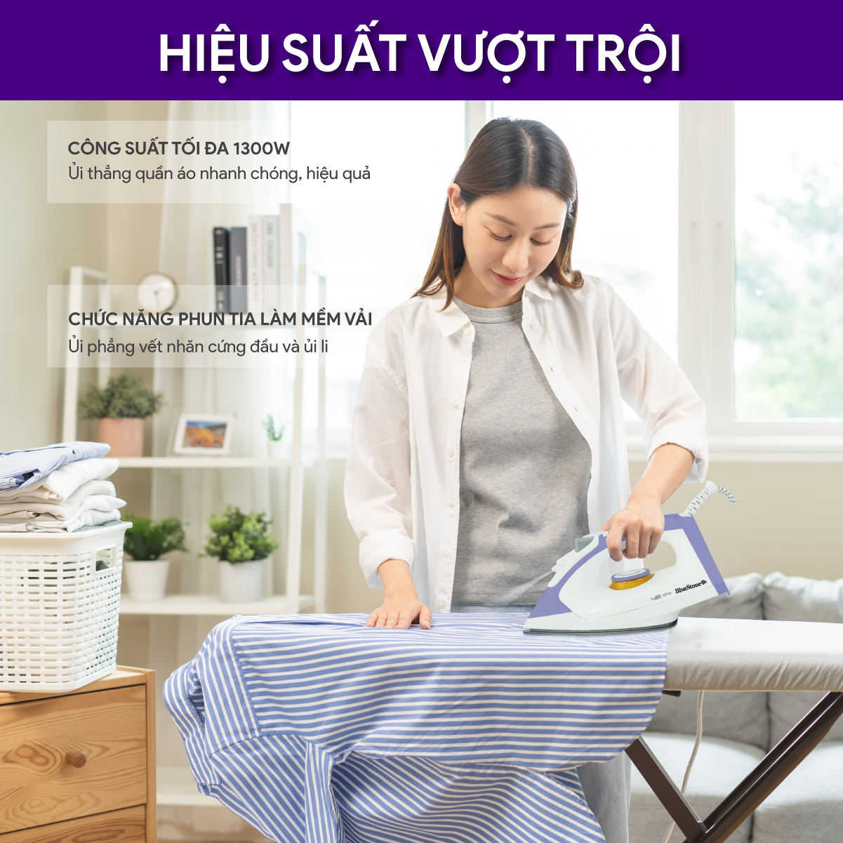 Bàn ủi khô Bluestone DIB-3726 - Công suất từ (1100-1300) W, giúp ủi quần áo nhanh thẳng và tiết kiệm thời gian. - Mặt đế phủ lớp chống dính cao cấp giúp bàn ủi lướt