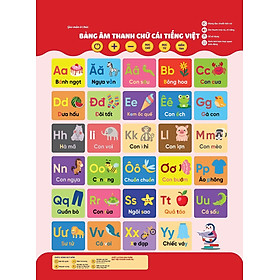 - Bảng chữ cái tiếng Việt: bao gồm 29 chữ cái tiếng Việt, 29 từ vựng tiếng Việt có chứa chữ cái tương ứng và 29 hình ảnh minh họa cho từ vựng tiếng Việt.