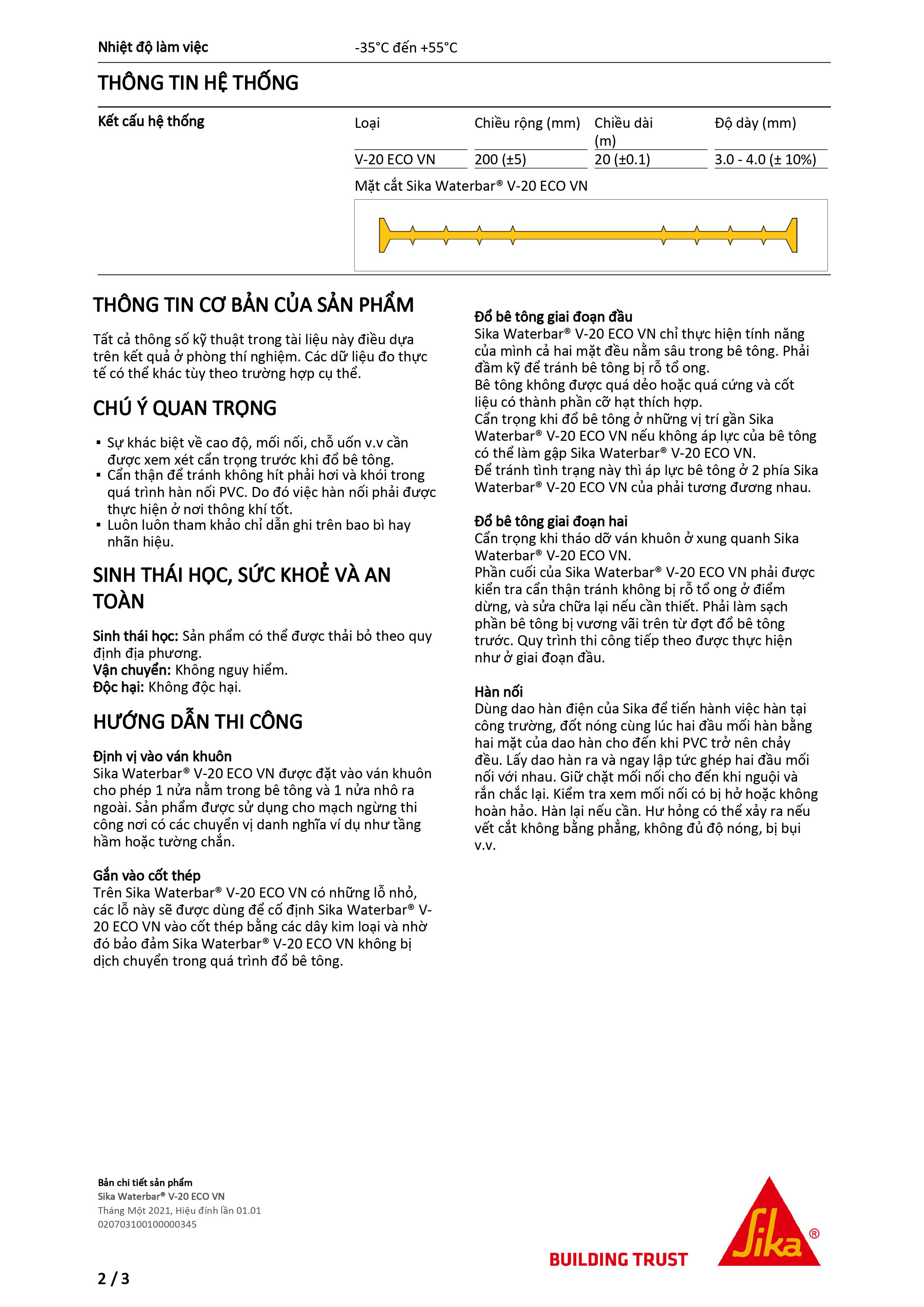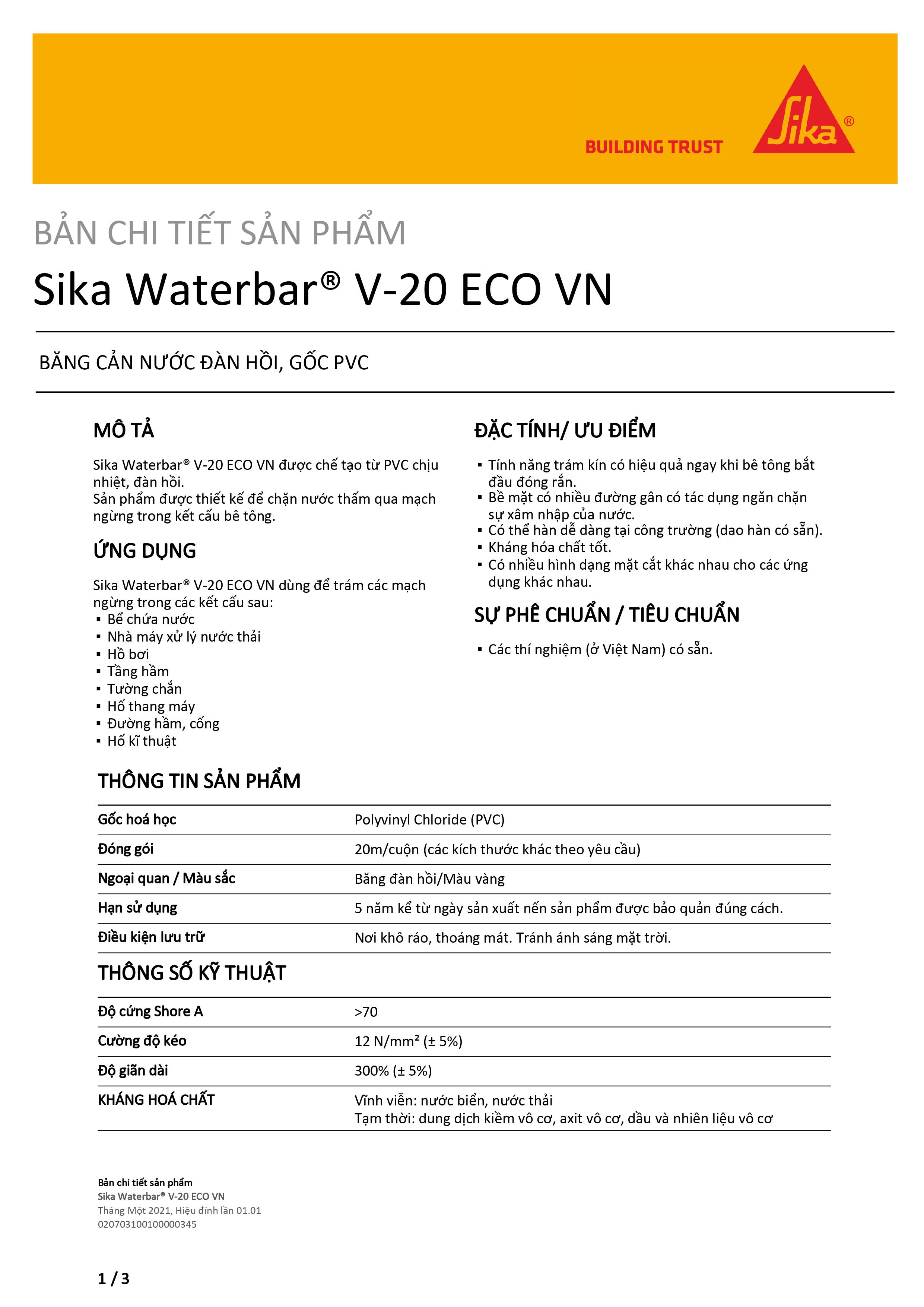 Mô tả: Sika Waterbar V-20 ECO VN được chế tạo từ PVC chịu nhiệt, đàn hồi.