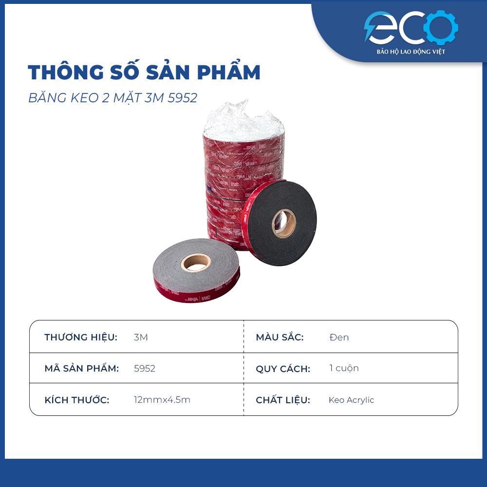 Băng keo cường lực siêu dính 2 mặt 3M 5952 – Kết dính siêu mạnh, thay thế đinh vít Băng keo 3M VHB 5952 là dòng băng keo cường lực siêu dính 2 mặt, thuộc dòng VHB (Very High Bond) của 3M, nổi bật với độ bám dính cực cao, chịu lực tốt, thích hợp để thay thế khoan, vít trong nhiều ứng dụng. ️ Thông tin sản phẩm.