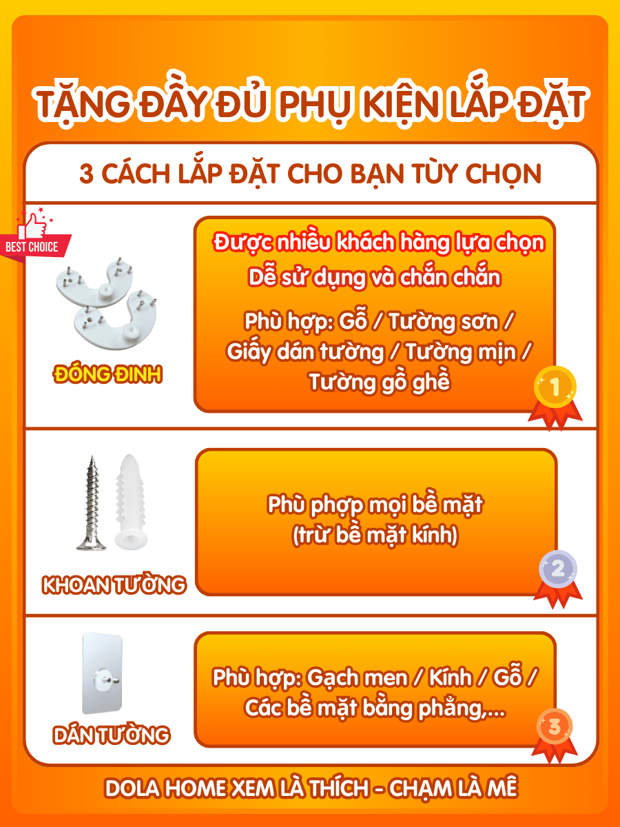 Tặng kèm tắc kê, vít treo, đinh, miếng dán để treo sản phẩm