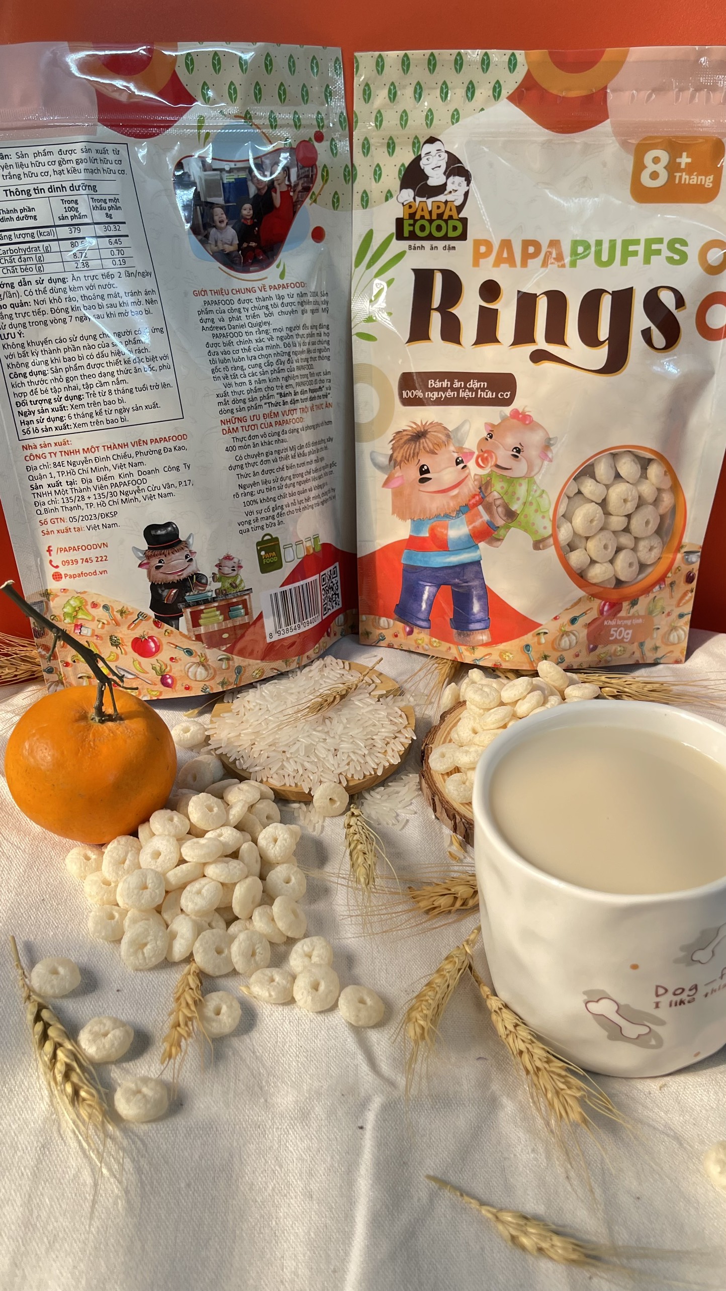 1. Tên sản phẩm: Bánh ăn dặm PAPAPUFFS RINGS - 100% Nguyên Liệu Hữu cơ 2. Thành phần: Sản phẩm được sản xuất từ 100% nguyên liệu hữu cơ gồm gạo lứt hữu cơ 70%,