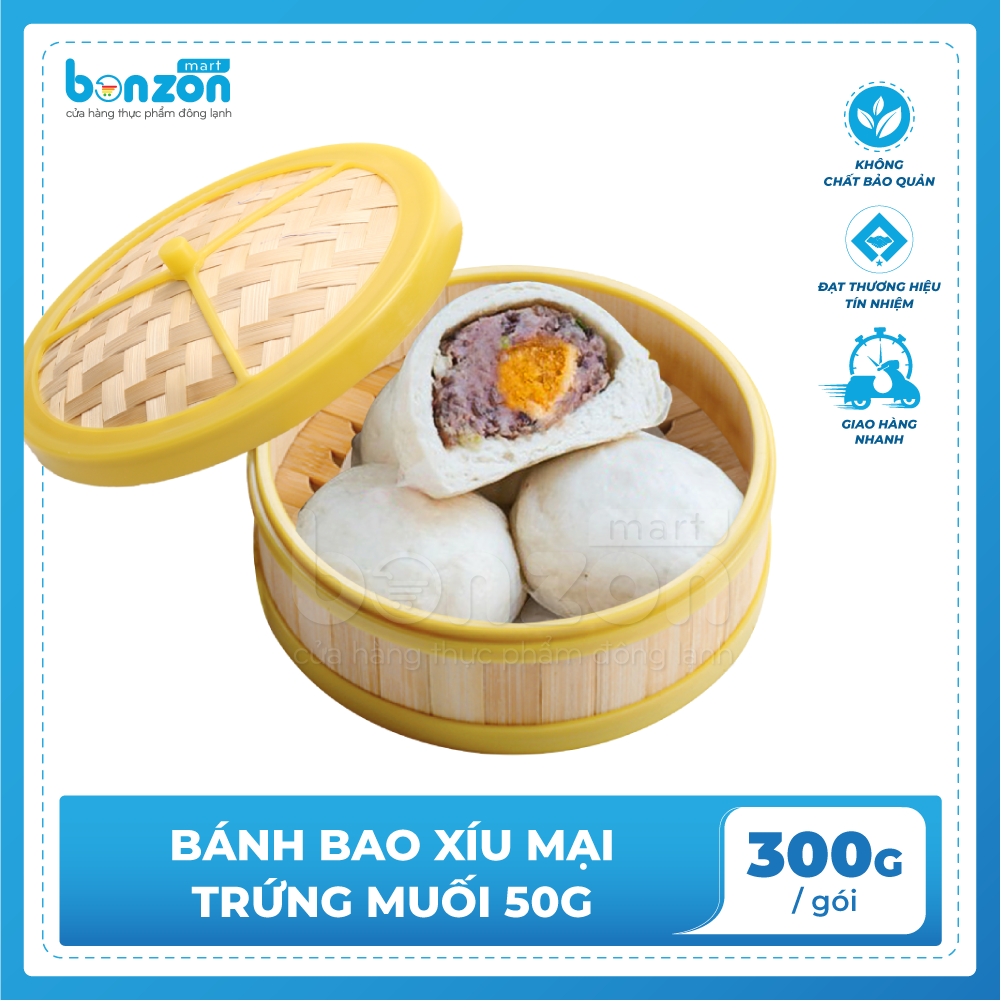 Với sản phẩm tươi sống, trọng lượng thực tế có thể chênh lệch khoảng 10%. ĐỊNH LƯỢNG: 50g/cái x 6 cái/gói THÀNH PHẦN: Vỏ bánh bao. Nhân: thịt heo, trứng vịt muối, hành tím, hành