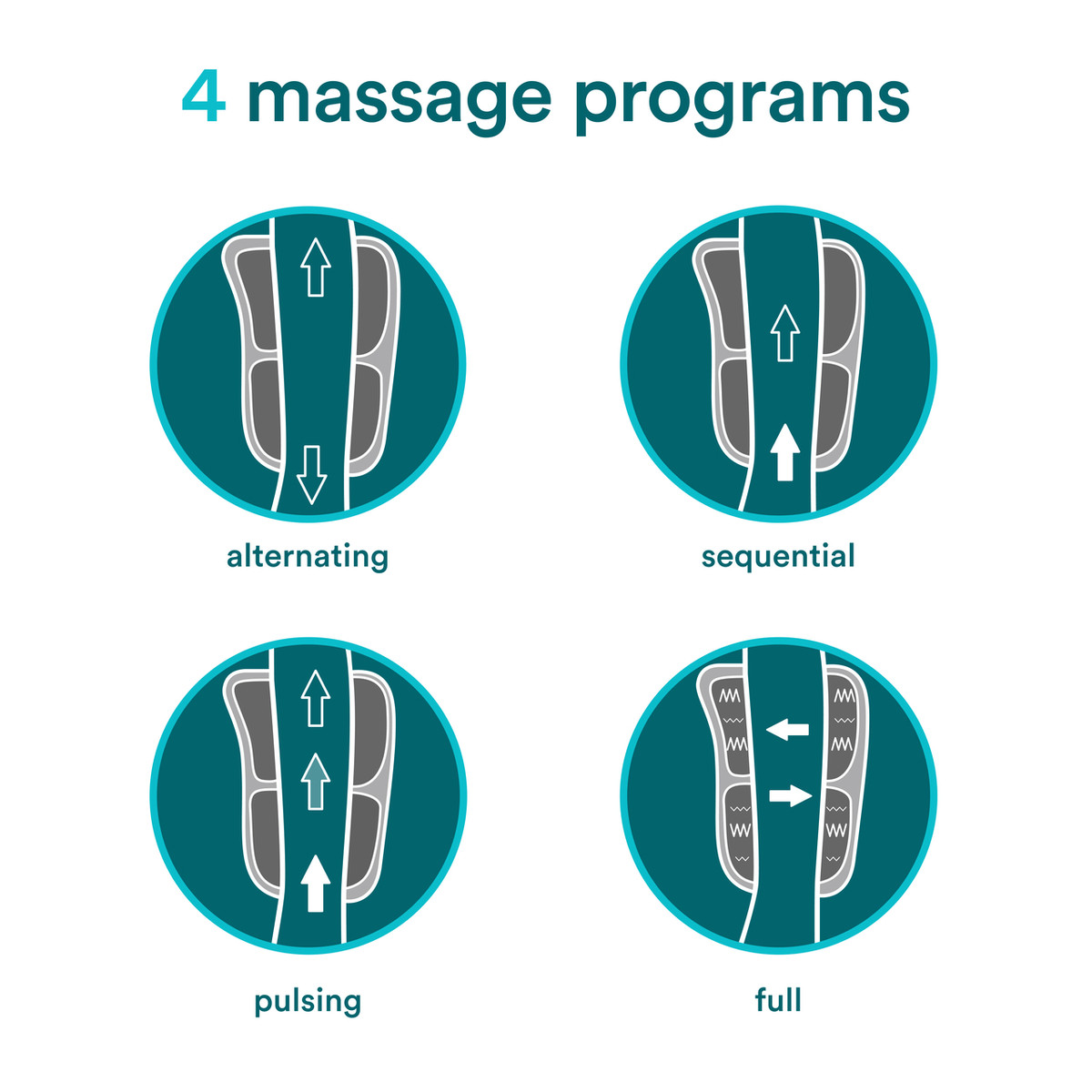 Bao massage này cung cấp 4 chương trình nén khí với cường độ có thể điều chỉnh và 3 chế độ nhiệt làm dịu. Bạn sẽ trải nghiệm sự phục hồi tối ưu trong thời gian ngắn, với chu kỳ bơm hơi và xả hơi hoàn toàn chỉ trong 20-30 giây.