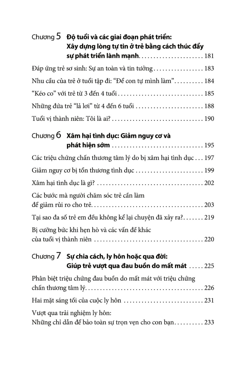 Không tự giới hạn trong những cách khắc phục chấn thương ngay từ đầu với những phương pháp sơ cứu cảm xúc hay phòng ngừa từ những dấu hiệu xuất hiện sớm nhất, “Bảo vệ trẻ trước chấn thương tâm lý” còn hướng dẫn và mô tả các bước trị liệu cho trẻ từng bị chấn thương từ nhiều năm mà nay biểu hiện qua các triệu chứng như lo âu hay trầm cảm.