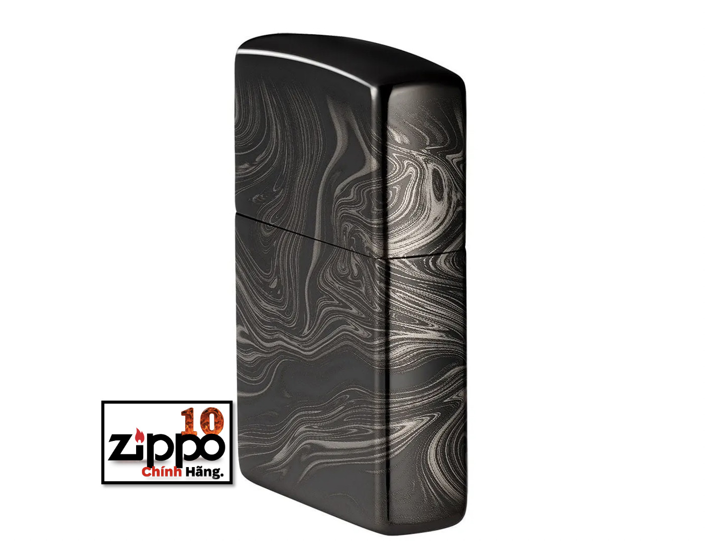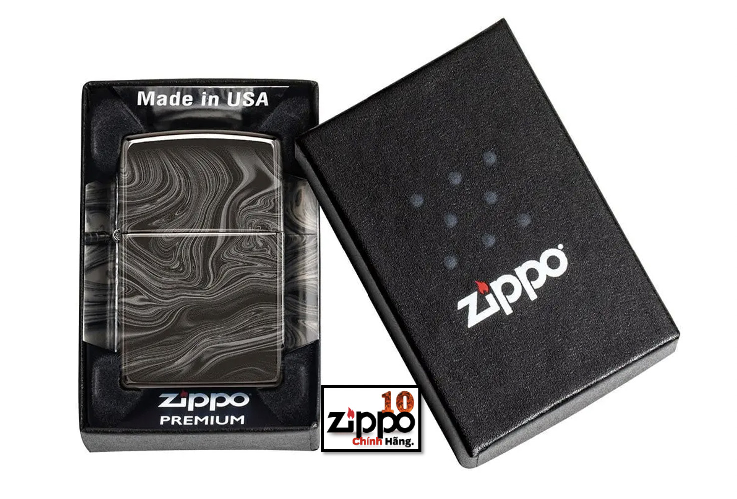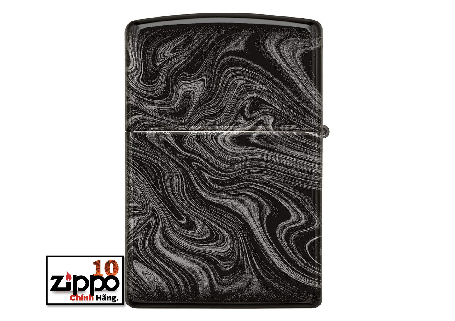 Thiết kế mới hoa văn vân đá cẩm thạch được tạo trên chiếc bật lửa Zippo đồng thau, nền mạ High Polish Black bằng qui trình in hình ảnh màu 360° của Zippo. Được đóng