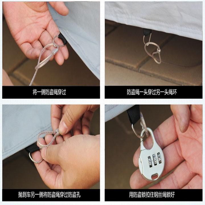 - Có khóa kéo phía cửa lái, có dải phản quang ở tai gương, có dây may sẵn 4 góc để cột bánh.