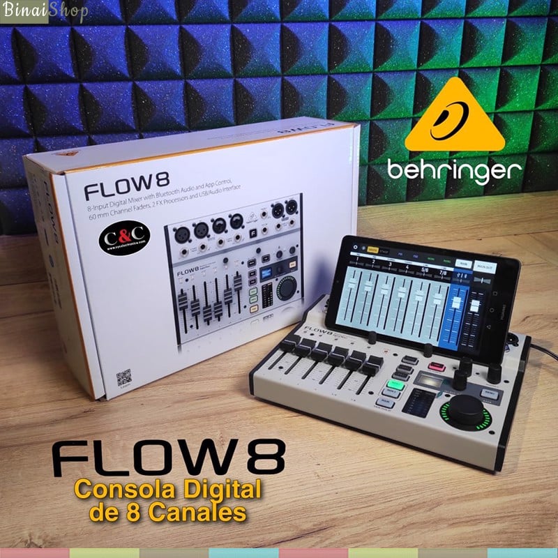 Mixer Behringer FLOW 8 là dòng mixer cơ lai số với thiết kế 8 kênh đầu vào điều khiển tín hiệu âm thanh trong đó có 2 đầu vào tiền khuếch đại micro midas với công suất ảo 48V