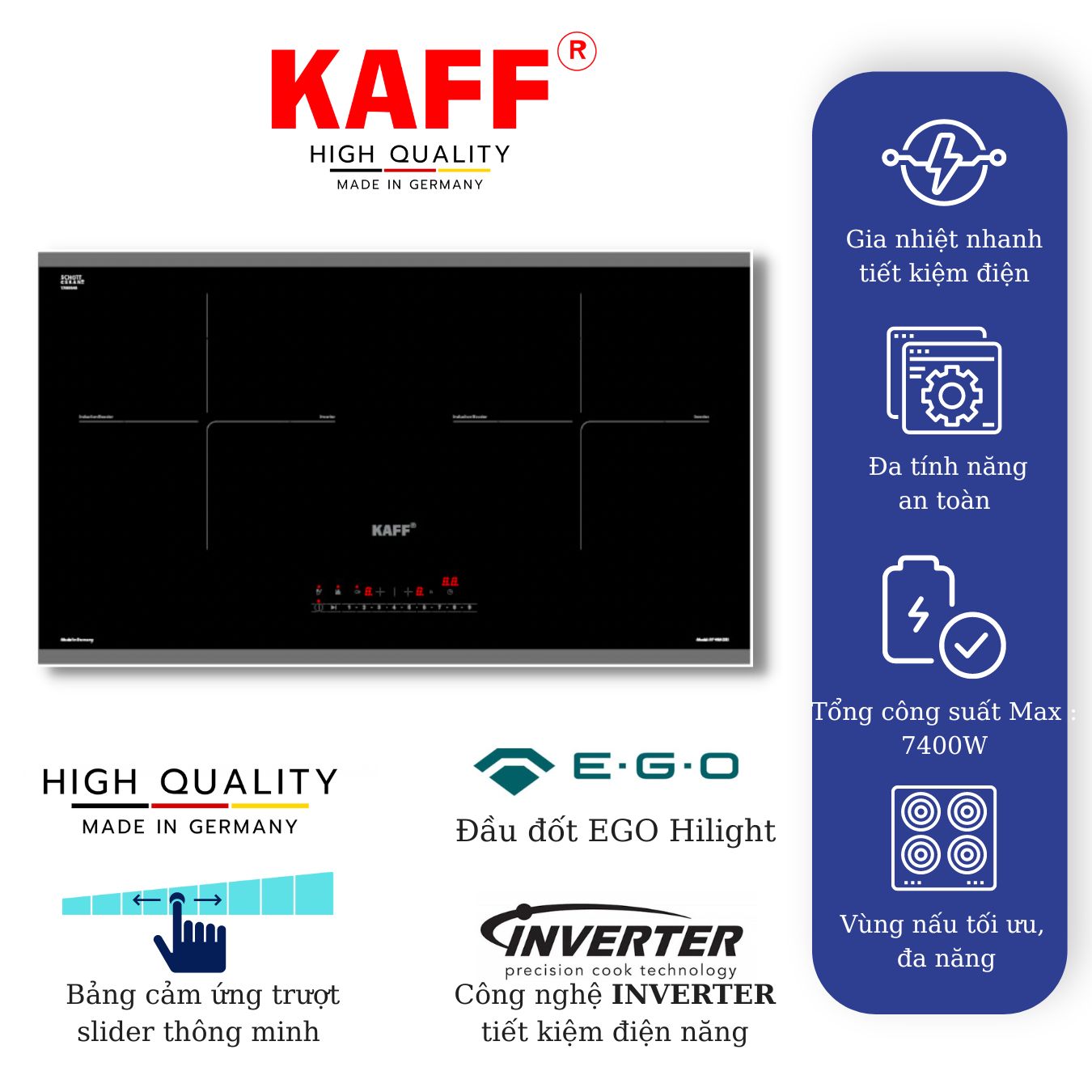 • Bếp 02 từ Domino ngang • Mặt kính Schott Ceran Made in Germany siêu bền, chịu lực chịu sốc nhiệt • Bo mạch EGO Made in Germany • Công nghệ biến tần INVERTER tiết