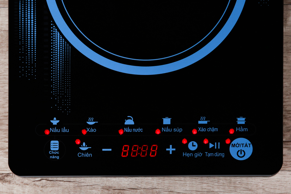 Bếp từ Midea MI-T2117DC có màu đen, họa tiết màu xanh nổi bật, sang trọng trong không gian đun nấu