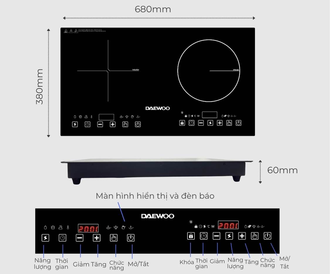 • Bếp đôi điện từ hồng ngoại Daewoo DWHB-3801C là sản phẩm mang lại sự tiện nghi, an toàn và hiệu quả tối ưu cho công việc bếp núc. Với thiết kế hiện đại, tính năng đa dạng và công suất mạnh mẽ, sản phẩm không chỉ đáp ứng nhu cầu nấu nướng mà còn góp phần làm đẹp không gian bếp của bạn.