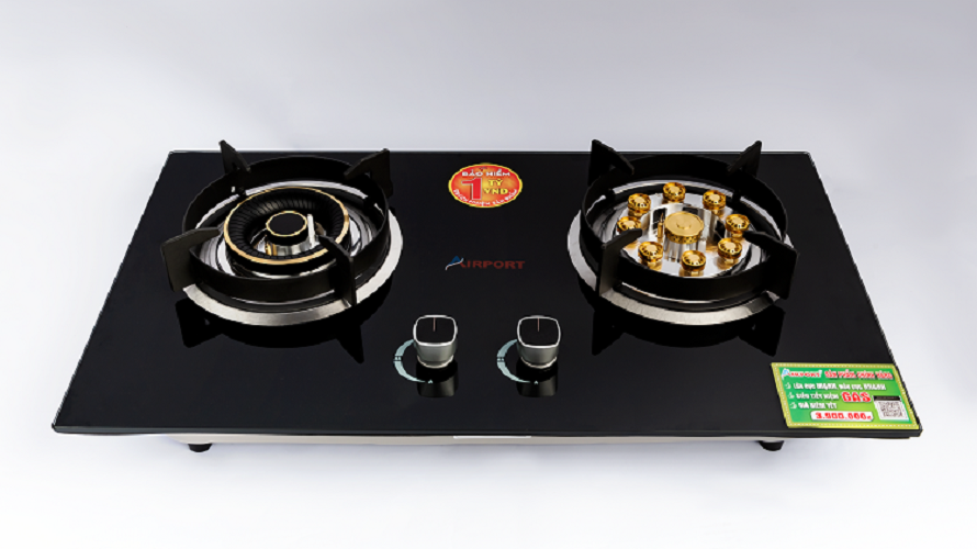 Bếp 02 lò: 01 lò to, 01 lò nhỏ Mâm chia lửa bằng đồng Hệ thống đánh lửa pin Pép hầm tiết kiệm gas Mặt kính cường lực, màu đen  Kiềng gang đúc Lượng gas
