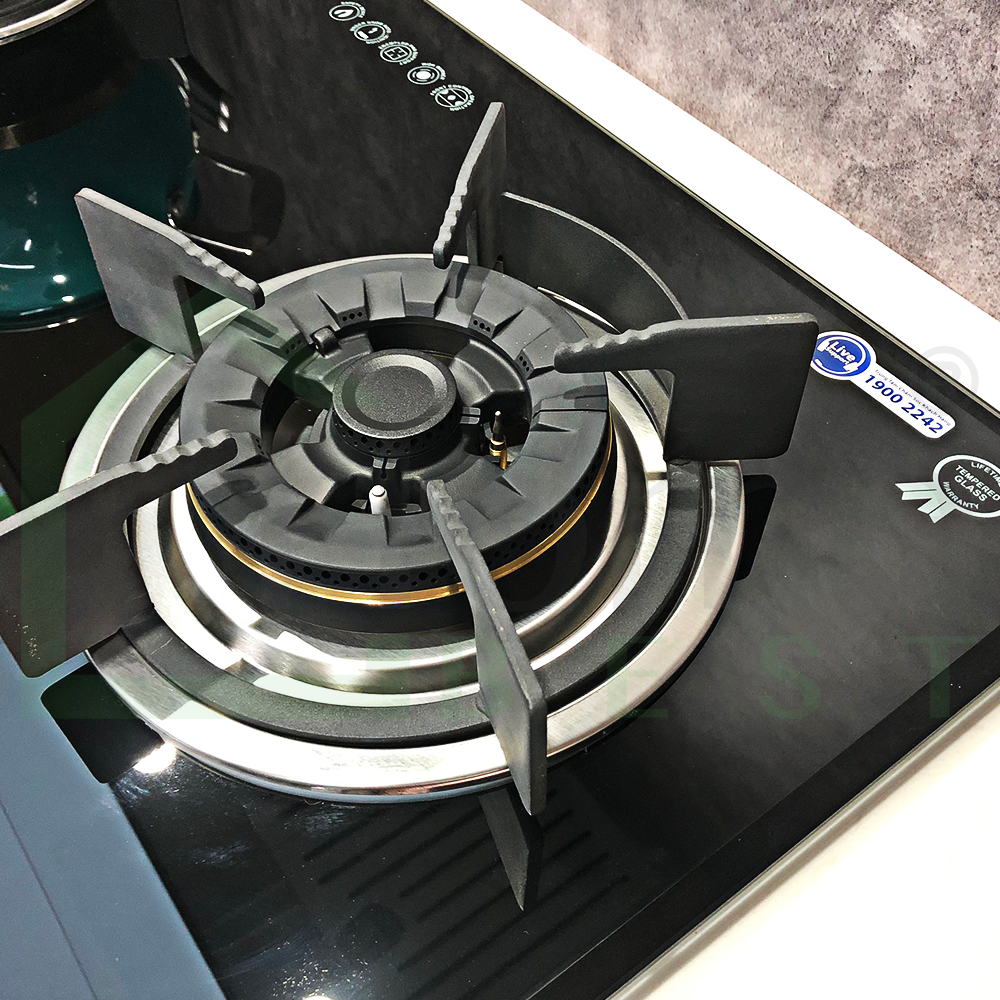Bếp 02 lò: 01 lò to, 01 lò nhỏ Mâm chia lửa bằng đồng Hệ thống đánh lửa pin Pép hầm tiết kiệm gas Mặt kính cường lực, màu đen  Kiềng gang đúc Lượng gas