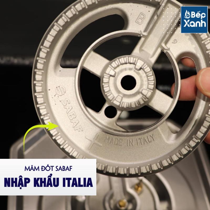 Bếp 02 lò: 01 lò to, 01 lò nhỏ Mâm chia lửa bằng đồng Hệ thống đánh lửa pin Pép hầm tiết kiệm gas Mặt kính cường lực, màu đen Kiềng gang đúc Lượng gas