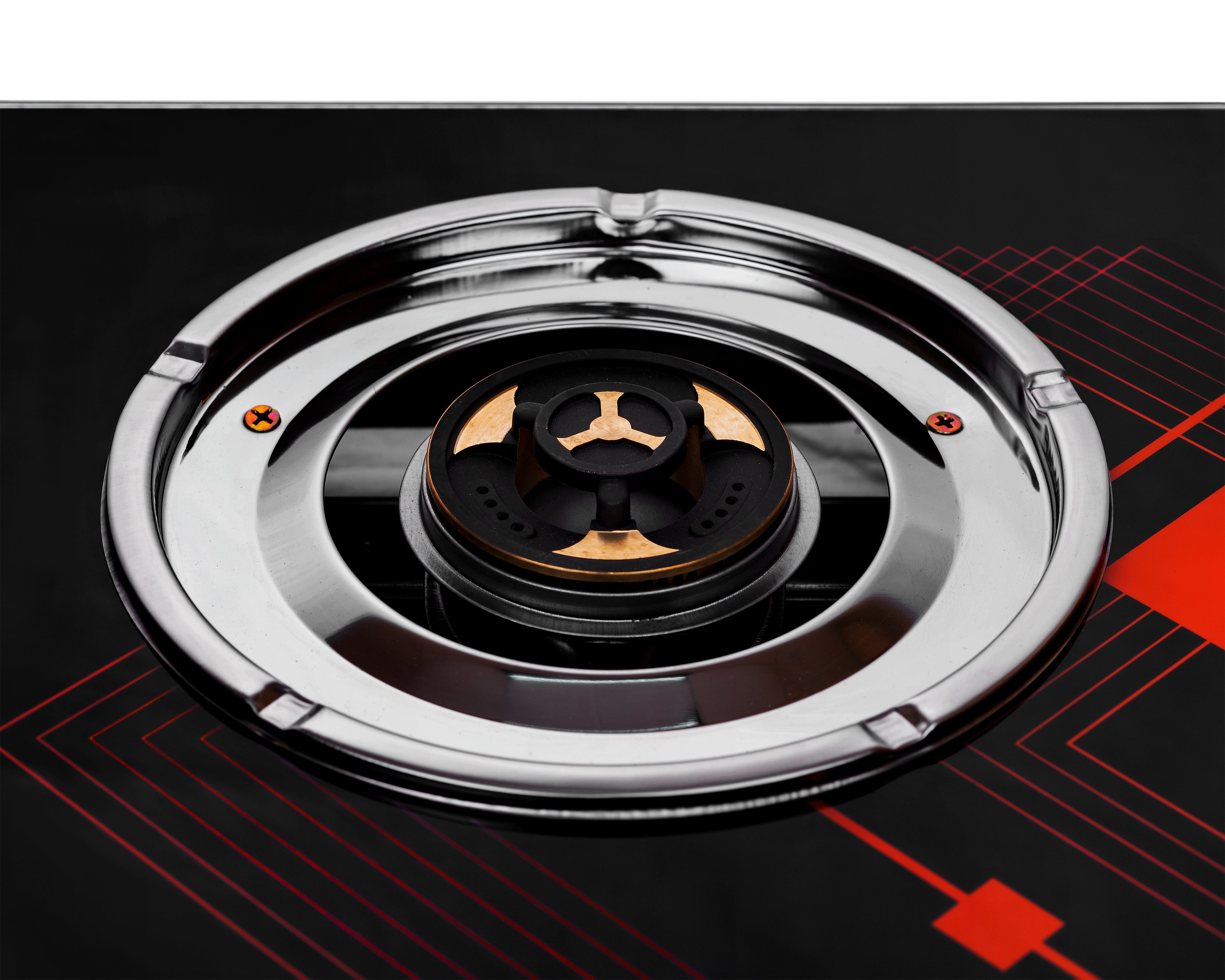 * Mặt kiếng cao cấp chịu lực, chịu nhiệt, thiết kế hoa văn sang trọng; - Thân bếp làm bằng inox chống rỉ sét, cao 60mm; - Núm vặn kiểu Rinnai; - Kiềng thép sơn
