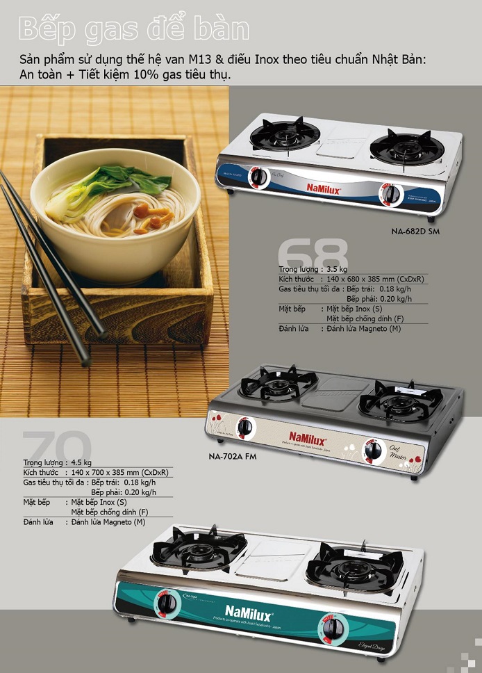 - Sản phẩm sử dụng thế hệ van M13 và điếu Inox theo tiêu chuẩn Nhật Bản: An toàn, tiết kiệm 10% gas tiêu thụ - Thiết kế sang trọng, trang nhã, phù hợp với