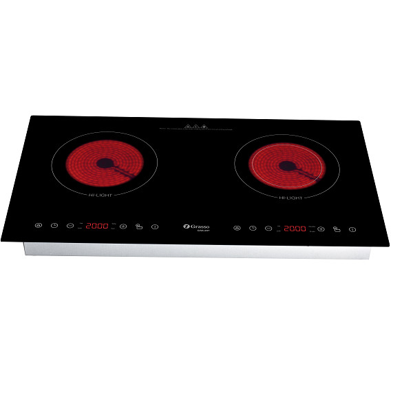 Bếp 02 điện Mặt kính crystal siêu bền, chịu lực chịu sốc nhiệt 9 dải công suất Điều khiển cảm ứng Slider độc lập dạng ẩn trực tiếp trên mặt bếp Chế độ hẹn giờ,
