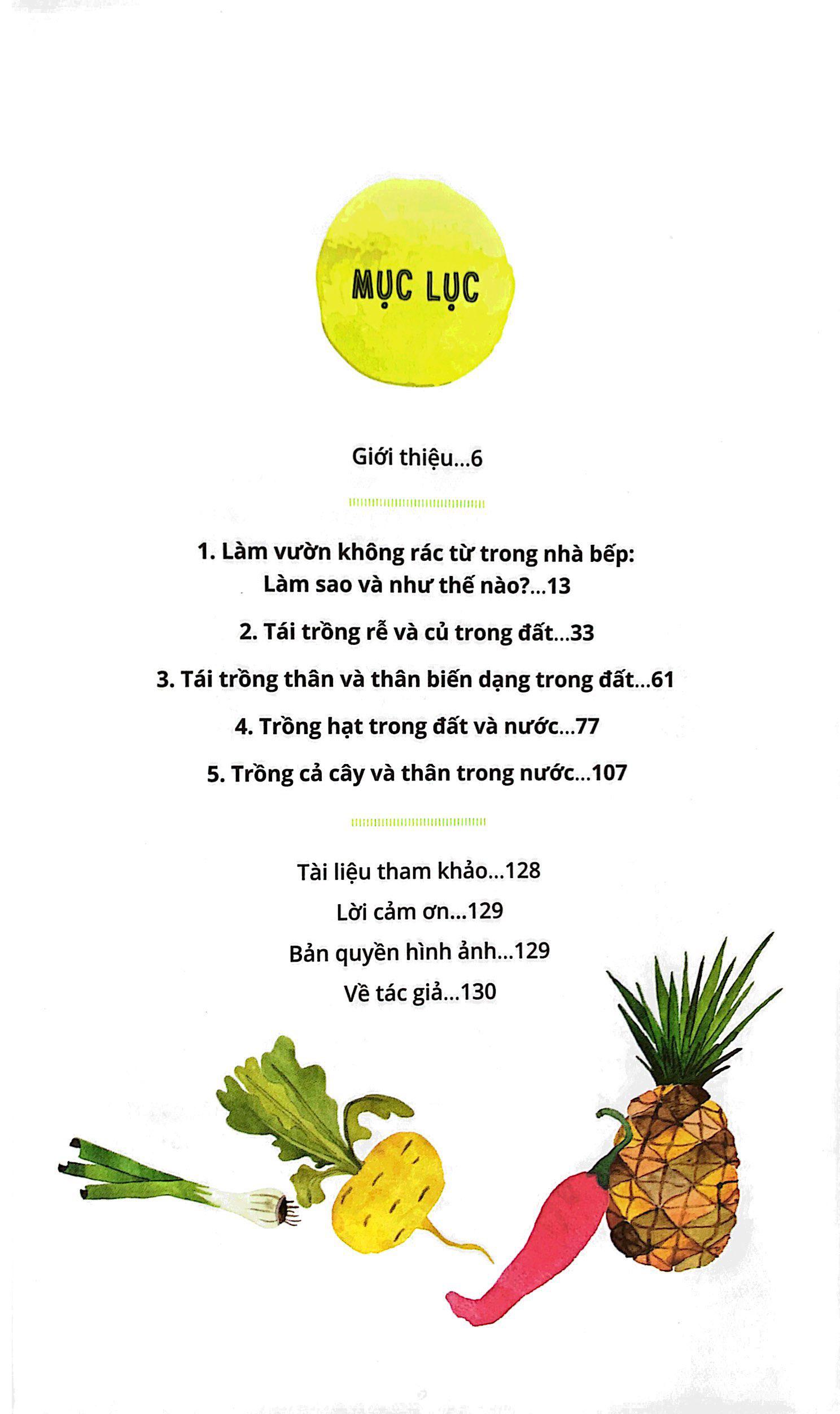 Bếp Không Rác - Tái Sinh Rau Củ Xã hội của chúng ta phát triển được là nhờ lối sống tái sử dụng và tái chế ngay từ những ngày đầu lập nước và những cuộc chiến tranh thế giới tới một xã hội đề cao sự tiện lợi và chủ nghĩa tiêu dùng trong những năm hậu chiến, và kết quả là rất nhiều rác thải – vỏ lon, vỏ chai, túi nhựa, Nhưng nhiều năm nay, xu hướng đã nghiêng về phía có ý thức hơn. Hiện nay, phong trào chính trị và xã hội cổ súy lối sống “không rác” chắc chắn đã sát cánh cùng chúng ta, như đã thấy trên các tạp chí, sách vở và các cuộc tranh luận chính trị – chưa nói đến việc nhiều người đang âm thầm sống theo phương châm đó. Những ngày này, một số người đã tuân thủ rất tốt nguyên tắc sống không rác tới mức một năm họ thải ra không quá một bao rác. Hầu hết chúng ta không nhất thiết phải làm và làm được y như thế. Nhưng chúng ta có thể nhìn lại cuộc sống hằng ngày của m.ình và tìm xem m.ình có thể tái chế, tái sử dụ và thậm chí tái trồng cái gì hay không – tái trồng, chính là chủ đề của cuốn sách này. Một khi bạn đã bắt đầu, sống theo kiểu ít hoặc không rác gần như có thể trở thành một trò chơi, nhưng trò chơi này đem đến kết quả hữu hình. Càng ngày, người tiêu dùng ở mọi lứa tuổi càng bước sâu vào lối sống không rác vì nhiều lý do và quan điểm cá nhân khác nhau. Một số vì thái độ sống “xanh” và cảm thấy cần thiết phải bảo vệ hành tinh này, trong khi có những người thấy vấn đề tự cung tự cấp là điều cấp bách và muốn có thể sống tốt trong bất cứ tình huống nào. Dù động cơ là gì thì những người muốn sống một đời không rác này đều có rất nhiều cách thực tế để bắt đầu. LỐI SỐNG KHÔNG RÁC Những người sống không rác luôn tìm cách cắt giảm rác thải, tiết kiệm nước và làm xanh sạch ngôi nhà và mảnh vườn của m.ình. Và có không ít cách để thực hiện điều đó. Trước hết, khi bạn đi mua đồ, hãy tìm những món mà đồ đựng có thể tái chế hoặc tái sử dụng. Nếu có thể, hãy mua sỉ và chọn sản phẩm nào không được đóng gói. Hãy đổ rác từ sân vườn (lá rụng, cành cây, cỏ, lá cỏ xén) vào hố để làm phân hữu cơ hoặc đưa vào chương trình thu gom rác phân hủy sinh học của thành phố. Chỉ cần để ý một chút thôi, bạn sẽ thấy có rất nhiều cách đơn giản để bảo quản và tái sử dụng nước, góp phần rất lớn vào việc tiết kiệm tài nguyên môi trường. Hãy đặt thùng đựng nước dưới ống dẫn nước mưa trên mái nhà để tưới cây trồng trong chậu, khay. Luôn có một xô khoảng 20 lít dưới mỗi vòi hoa sen trong nhà tắm để trữ nước lạnh lúc đầu bạn mở vòi trước khi nước nóng lên. Bạn có thể sử dụng nước đó để tưới cho cây trồng trong nhà. Sau khi đã trụng mỳ Ý và rau, giữ nước đó lại, để nguội dùng làm nước tưới cây bên ngoài. Chúng ta thường xem làm vườn là hành động “xanh”, nhưng thực ra nó cũng có thể thải ra khá nhiều rác: cây trồng mới trong các chậu nhựa, trấu công nghiệp phủ đất và phân bón cũng đều là một nguồn rác thải. Xuất phát điểm cho việc làm vườn không rác là tái sử dụng tất cả sinh khối (cành lá rụng, lá cỏ cắt xén) trong vườn. Từ cành khô đến cỏ xén, cỏ nhổ, tới những thứ rác phân hủy từ vụ tổng vệ sinh vườn tược năm ngoái, vườn của bạn đã sinh ra nhiều vật chất hữu cơ. Thay vì đổ những thứ đó vào thùng rác, hãy chặt nhỏ chúng ra làm trấu, hoặc dựng một đống phân hữu cơ để bón đất. Thay vì năm nào cũng mua cây mới trồng trong chậu nhựa, hãy học cách gieo chính những hạt giống mà m.ình có. Hãy tham gia các chương trình đổi cây, ở đó, mọi người mang cây đến và đổi cho nhau. Chậu cũ, cốc sữa chua, và cả hộp đựng thức ăn hiệu Tupperware bị mất nắp, tất cả đều là những lựa chọn tuyệt vời để chia sẻ cây trồng. Trước khi vứt mọi thứ đi, hãy nghĩ xem có thể tái sử dụng chúng vào việc gì khác không. Tủ đựng tài liệu, xe cút kít cũ và những thứ đồ cũ khác đều có thể tạo ra những khu vườn thú vị và ngộ nghĩnh. Bạn có thể lấy đồ dùng cũ để tạo ra lưới mắt cáo hoặc cọc rào thú vị. Cuối cùng, sống không rác có nghĩa là nấu những gì bạn cần và ăn những gì bạn nấu, nhưng nó cũng có nghĩa là tận dụng cho kỳ hết mọi nguyên liệu nấu nướng. Khi nấu nướng rau củ quả, nếu để ý, bạn sẽ thấy thế nào m.ình cũng để lại một đống rác lớn mà thường là sẽ bị tống vào các hố rác phân hủy hữu cơ. Khoan đã nào! Giờ chúng ta sẽ thử một cách sống không rác triệt để nhất. Thực ra, bạn có thể tái trồng rất nhiều thứ từ rác thải nhà bếp thay vì làm phân hữu cơ. Hãy thử bàn đến chuyện sống không rác một cách triệt để nhất nhé! MỤC LỤC: