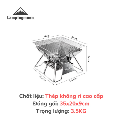 BẾP NƯỚNG THAN HOA GẤP GỌN CAMPINGMOON MT-2 THÔNG TIN SẢN PHẨM: - Thương hiệu: Campingmoon - Mã sản phẩm: MT-2 - Chất liệu: thép không gỉ, Inox - Kích thước chân đế: 35x35x26 cm - Kích thước vỉ nướng: 3534cm - Kích thước khi đóng gói: 35209cm - Trọng lượng: 3.5kg - Dùng cho: 4-5 người - Bộ sản phẩm gồm: Lưới nướng, thân lò, giá đỡ dưới, khay đựng tro, lưới carbon, túi bảo quản chống nước - Độ cao của vỉ nướng có thể điều chỉnh giúp mặt vỉ nướng không tiếp xúc quá gần với than, tránh thức ăn bị cháy khi nướng. - Xuất xứ: Trung Quốc