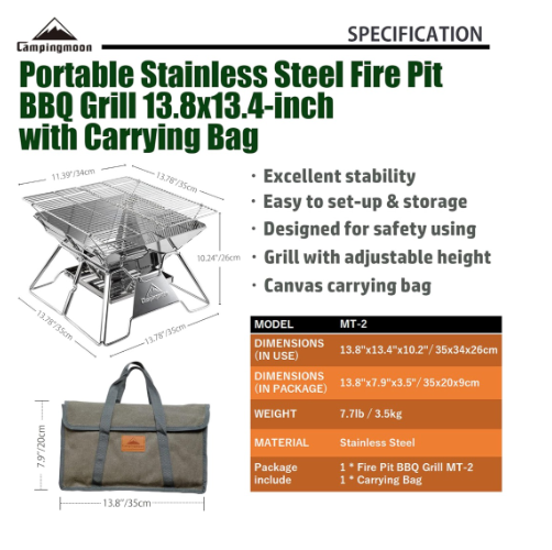 MÔ TẢ SẢN PHẨM BẾP NƯỚNG THAN HOA GẤP GỌN CAMPINGMOON MT-2 * THÔNG TIN SẢN PHẨM: - Thương hiệu: Campingmoon - Mã sản phẩm: MT-2 - Chất liệu: thép không gỉ, Inox - Kích