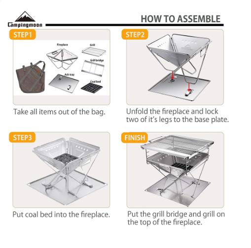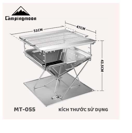 MÔ TẢ SẢN PHẨM BẾP NƯỚNG THAN HOA GẤP GỌN 8-10 NGƯỜI CAMPINGMOON MT-055 * THÔNG TIN SẢN PHẦM: - Thương hiệu: Campingmoon - Mã sản phẩm: MT-055 - Chất liệu: Thép không gỉ, Gang,