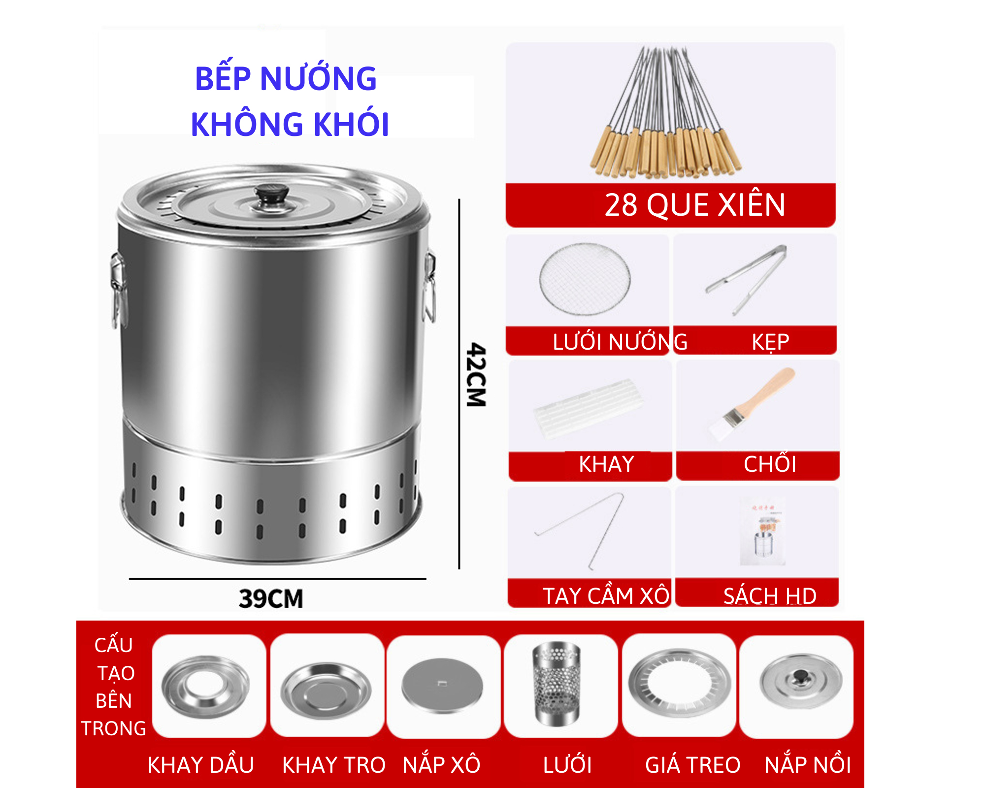Chi tiết: Thân bếp: Inox 201, que xiên: Inox 304