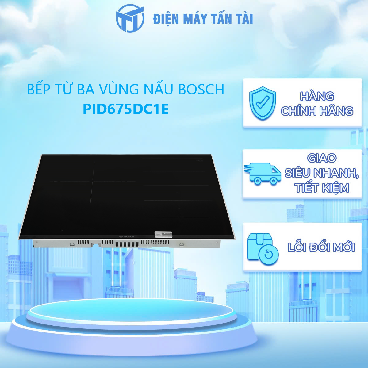 Thiết kế hiện đại, sang trọng • Kích thước 60cm nhỏ gọn, hình vuông tinh tế, gồm 03 vùng nấu tiện lợi, phù hợp với mọi không gian bếp. Tính năng thông minh, an toàn