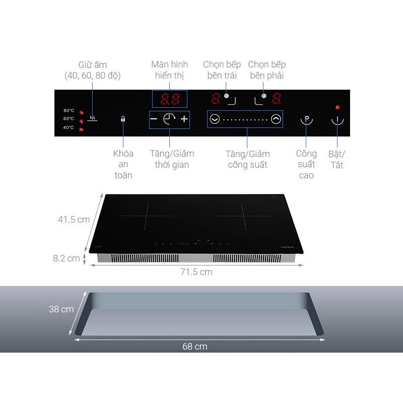 THÔNG SỐ KỸ THUẬT: – Điện áp 220V/50Hz – Trái 2000W/Booster 2300W – Phải 2000W/Booster 2300W – Kích thước (dài x rộng x cao): 750x430x60mm – Kích thước khoét lỗ: 695x395mm TÍNH NĂNG SẢN PHẨM: