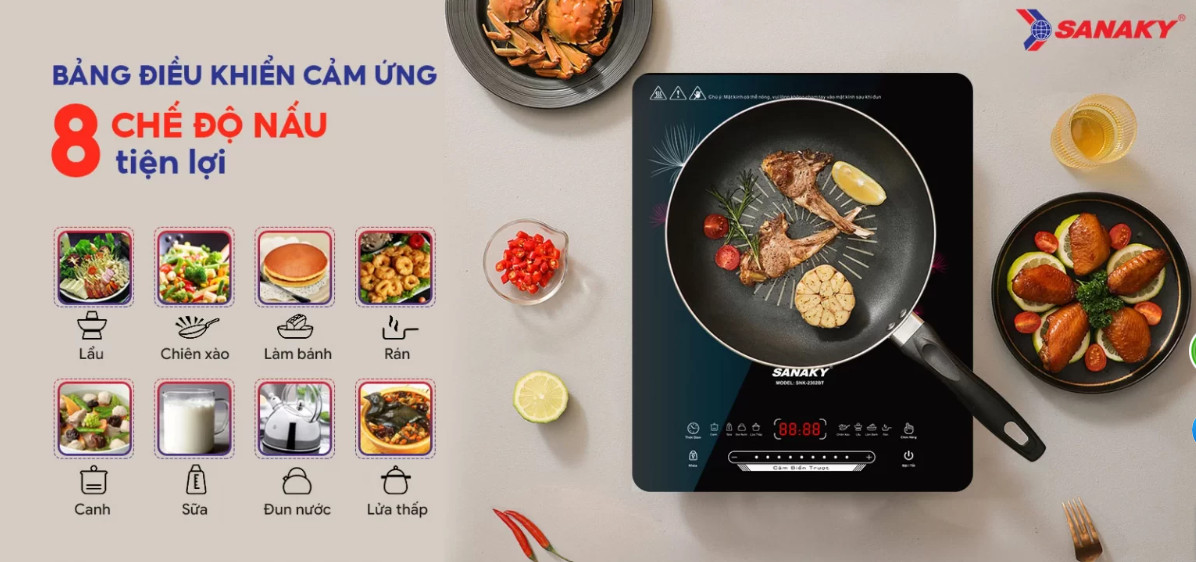 Mô tả sản phẩm 5 chế độ nấu tự độngBếp có các chế độ nấu là chiên, nấu lẩu, đun nước, hấp, nướng, bạn chọn một trong các chế độ này để chế biến món