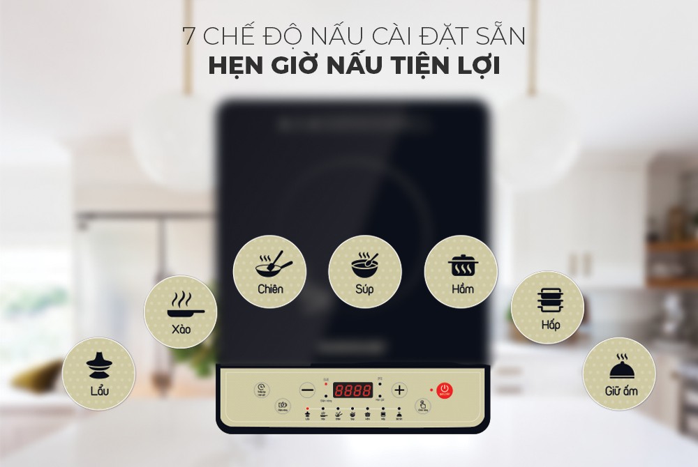 Mặt kính ceramic chịu nhiệt Mâm từ đường kính 22cm Mâm từ tự động nhận biết kích cỡ xoong nồi. Chức năng hẹn giời, chế độ xào rá Điều khiển công suất / nhiệt độ