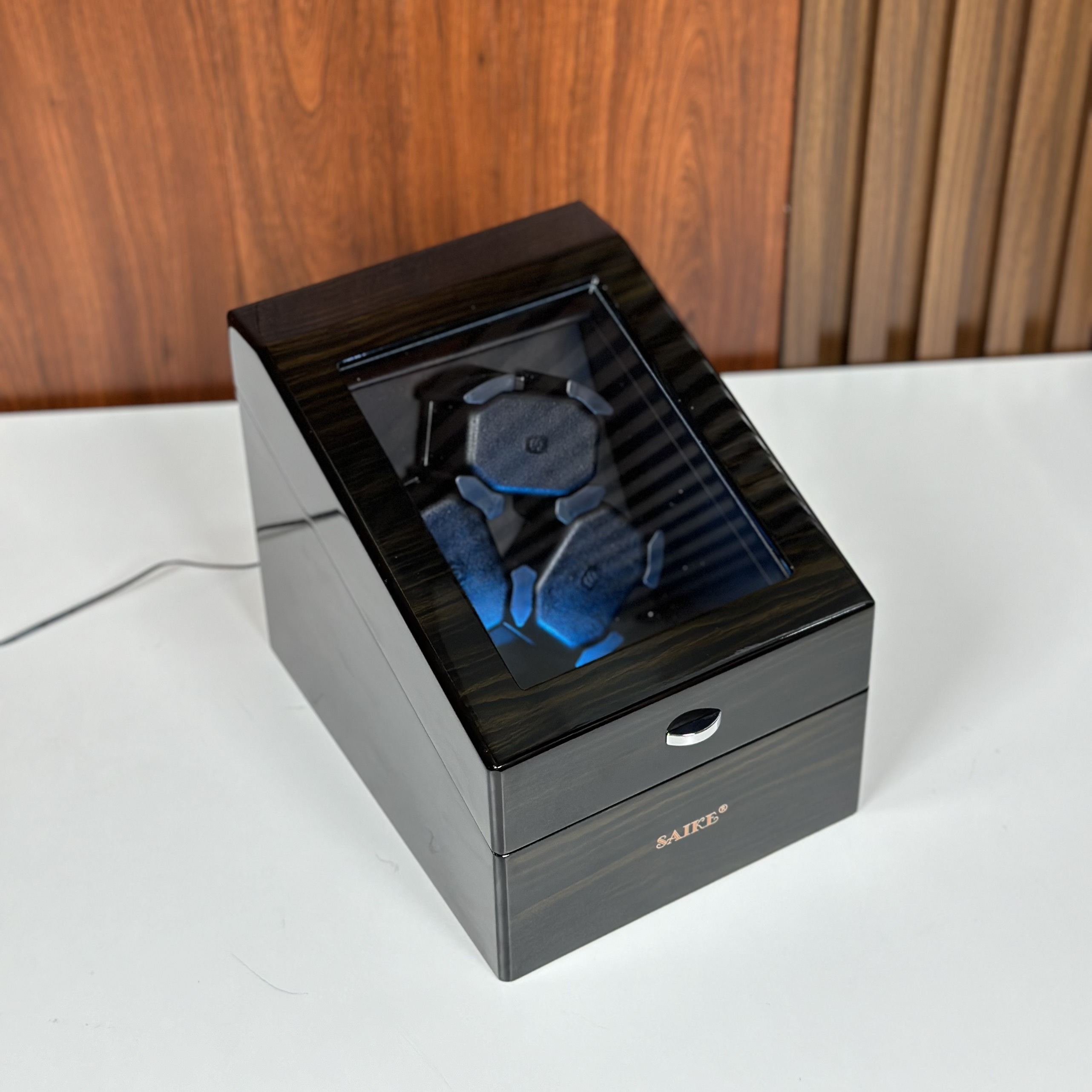 Hộp Xoay Đồng Hồ Cơ Mẫu 3 Xoay 3 Tĩnh SAIKE Vỏ Gỗ Sơn Vân Gỗ Mun Có Đèn