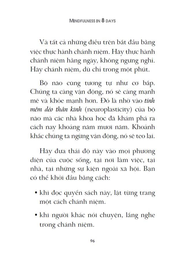 Khi đi qua 8 chương sách tương ứng với 8 ngày thực hành, bạn đọc sẽ học cách sống trọn vẹn giây phút hiện tại thông qua việc xem xét lại và nhìn nhận đúng đắn ý nghĩa thật sự của chánh niệm và những khái niệm có liên quan như “sự chú tâm”, “một thái độ lành mạnh”, “cái nhìn không phán xét”, “cái vai tôi đang mang không phải là tôi”, “trạng thái đang-là”, “người chứng kiến”