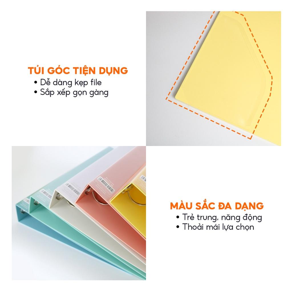 ĐẶC TÍNH NỔI BẬT: - 4 còng chữ O giúp túi tài liệu ngay ngắn (dễ sử dụng, phù hợp với nhiều loại túi 30 lỗ, túi 11 lỗ) - Bìa nhựa PP dày dặn,