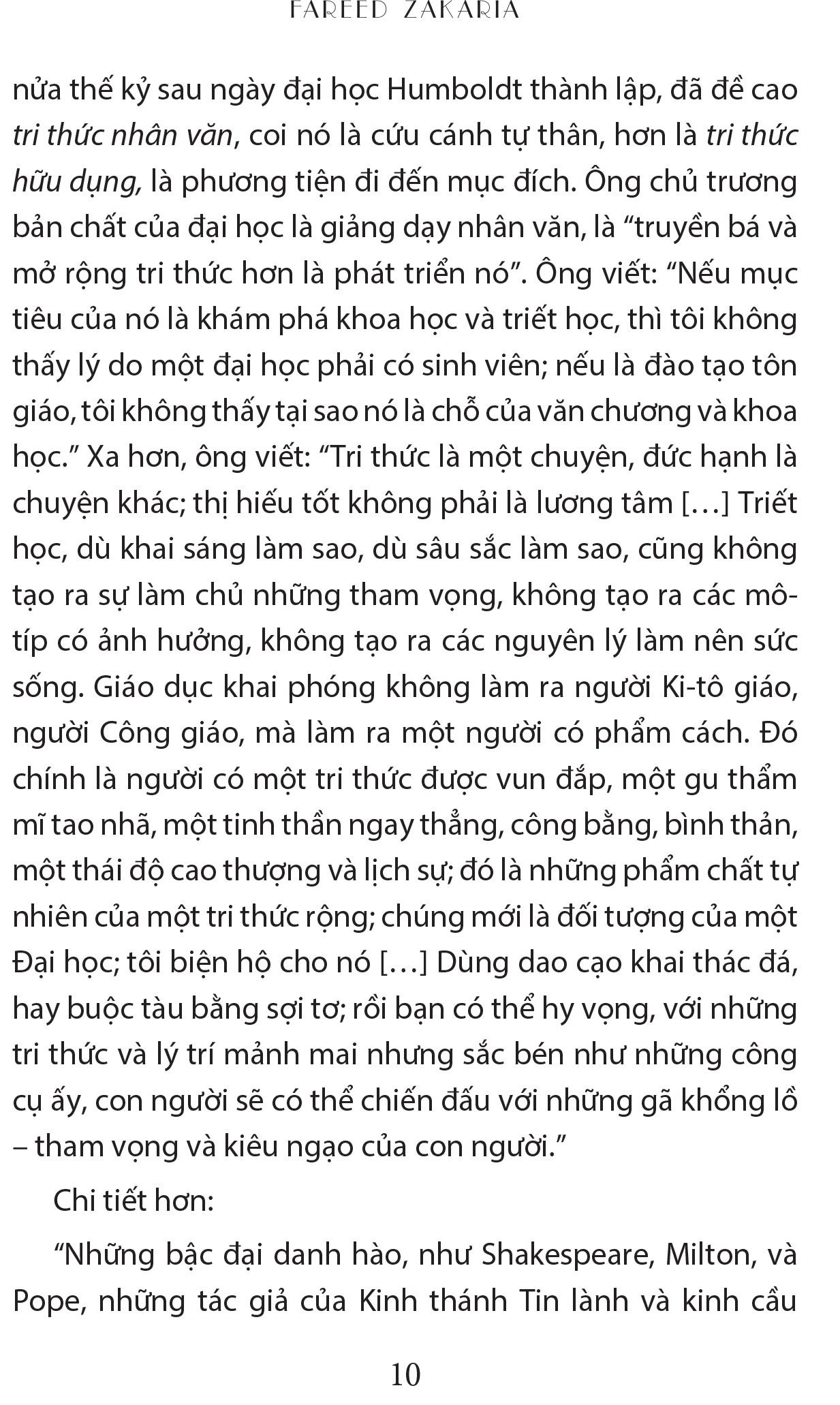 “Biện hộ cho một nền giáo dục khai phóng” là cuốn sách đầu tiên tại Việt Nam giới thiệu chi tiết về triết lý giáo dục khai phóng. Tựa sách được viết dưới lăng kính của một sử gia và nền tảng kiến thức của một nhà khoa học chính trị - Fareed Zakaria. Cuốn sách mang tới cho người đọc cái nhìn toàn diện về mọi khía cạnh của giáo dục khai phóng, đặc biệt là giáo dục khai phóng tại Mỹ, từ lịch sử đến những thay đổi trong cách nó được đón nhận, cùng với đó là những đề xuất để giáo dục khai phóng lấy lại vai trò cùng sức ảnh hưởng của nó trong thế giới hiện nay.