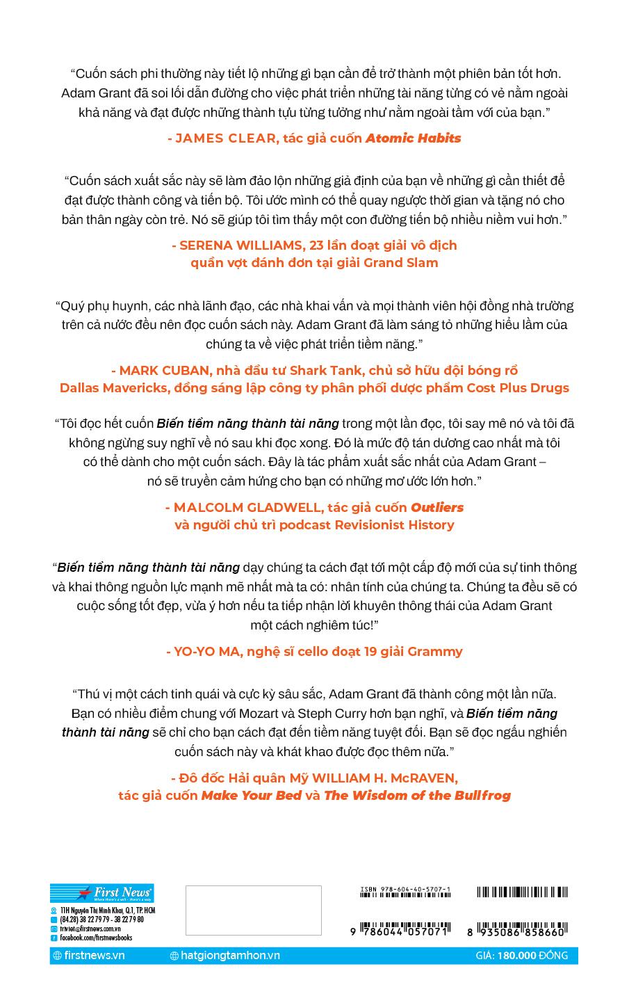 Thông qua những lập luận sắc bén và các ví dụ vừa thực tiễn vừa thú vị, Adam Grant giúp người đọc nhận ra rằng “thành công không chỉ là đạt được mục tiêu mà còn là sống theo các giá trị chúng ta coi trọng. Không có giá trị nào cao cả hơn việc khao khát trở thành một người tốt hơn so với phiên bản của ta ở hiện tại. Không có thành tựu nào vĩ đại hơn việc giải phóng tiềm năng còn đang ẩn giấu trong ta”. Vì lẽ đó, “Biến tiềm năng thành tài năng” không chỉ là một tác phẩm giàu cảm hứng mà còn mang đến một cái nhìn toàn diện về cách chúng ta có thể khai phá tiềm năng của bản thân và những người xung quanh.