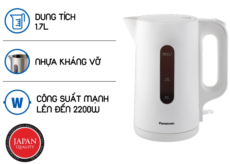 Ấm đun siêu tốc Panasonic NC-K101WRA - 1.7L - Nhựa kháng vỡ - Công suất mạnh lên đến 2200W