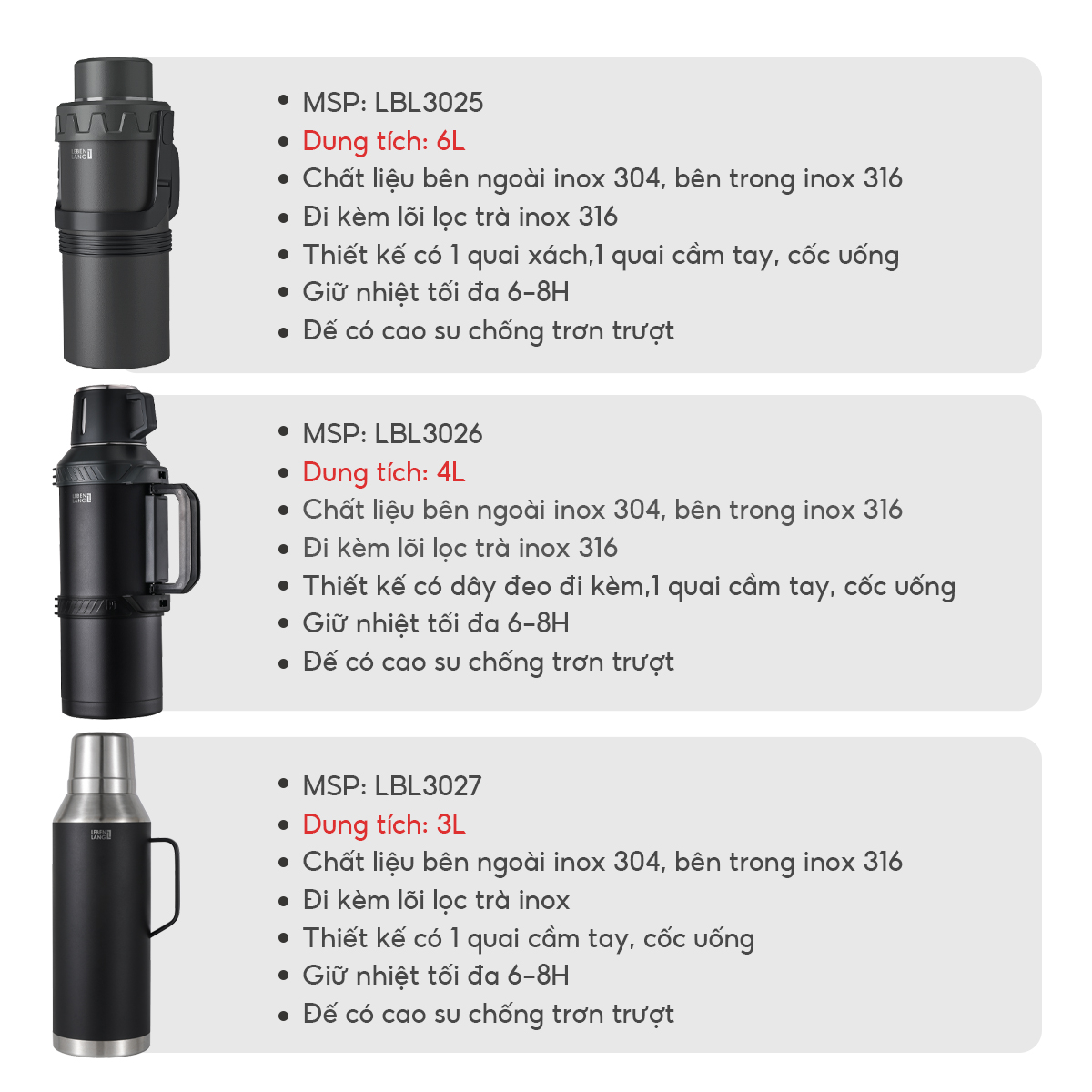 - Bình nước LBL3025 Khả năng giữ nhiệt 6–8 giờ – Giữ nóng và giữ lạnh hiệu quả, giúp bạn luôn có đồ uống ở nhiệt độ mong muốn suốt cả ngày.