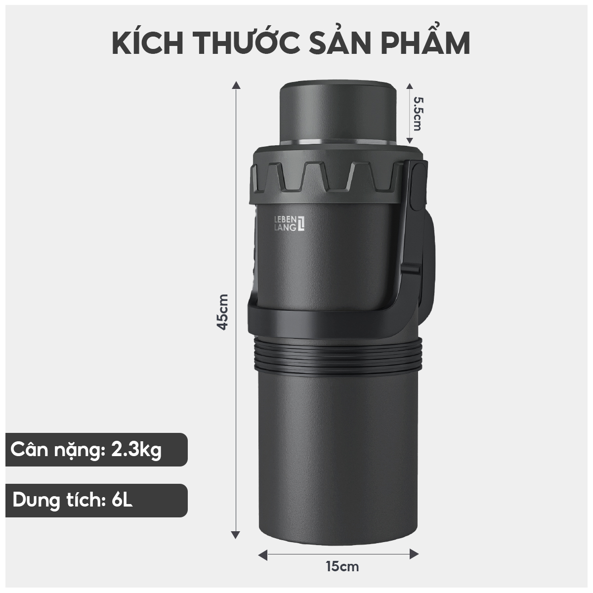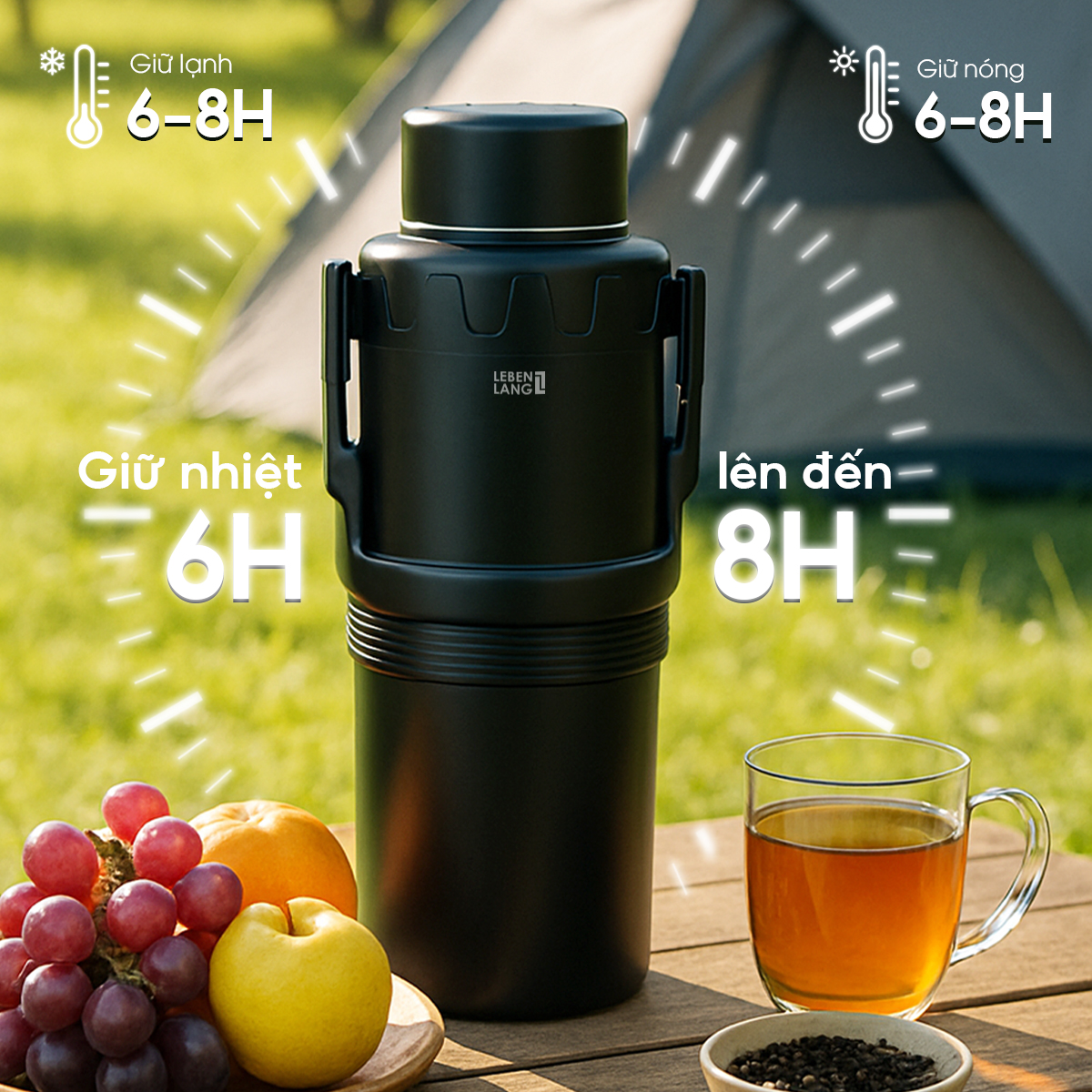 - Dung tích siêu lớn 6L – Phích giữ nhiệt Lebenlang dung tích 6000ml đáp ứng nhu cầu sử dụng cho cả gia đình, nhóm bạn hoặc tập thể. Phù hợp mang theo khi đi làm, picnic, du lịch, leo núi, câu cá hoặc dùng trong bệnh viện.