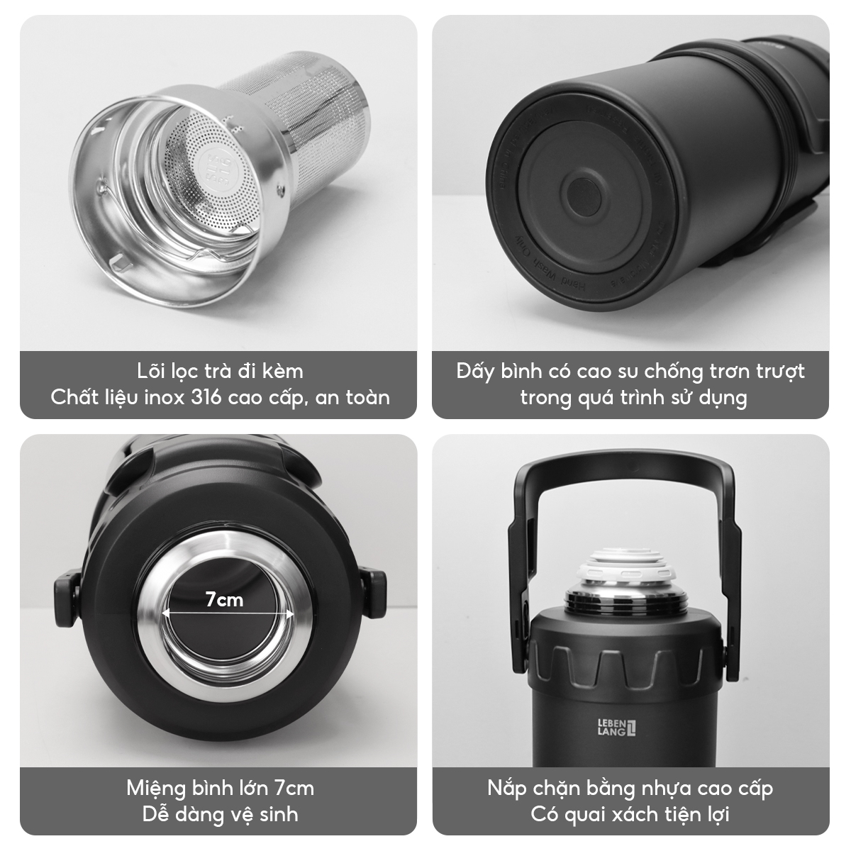 - Bình nước giữ nhiệt Lebenlang Lõi lọc trà inox 316 đi kèm – Giúp pha trà, lọc cặn và giữ hương vị nguyên chất. Rất tiện lợi khi muốn pha trà, nước thảo mộc hoặc nước trái cây kèm đá.