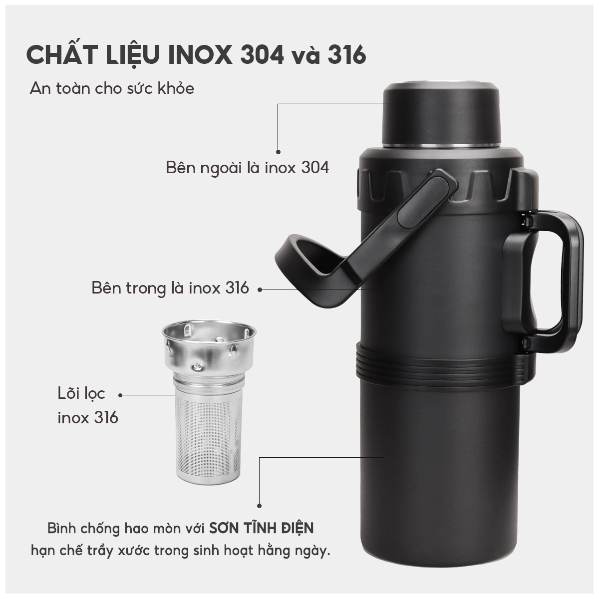 • Inox 304 sơn tĩnh điện sang trọng, bền đẹp theo thời gian  • Lõi inox siêu bền, chống vỡ nổ – sử dụng gần như vĩnh cửu   Khả năng giữ nhiệt vượt trội: •