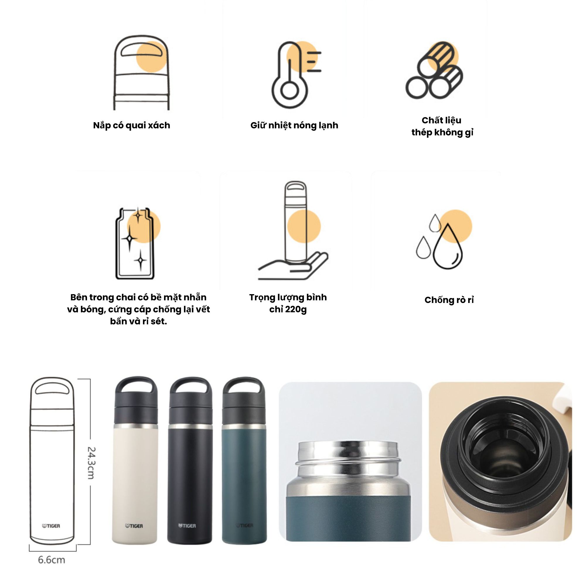 - Thép không gỉ 304 hợp vệ sinh - Nắp vặn không lo lắng về việc rò rỉ nước - Quai xách silicone thuận tiện mang đi và có thể tháo rời giúp dễ dàng
